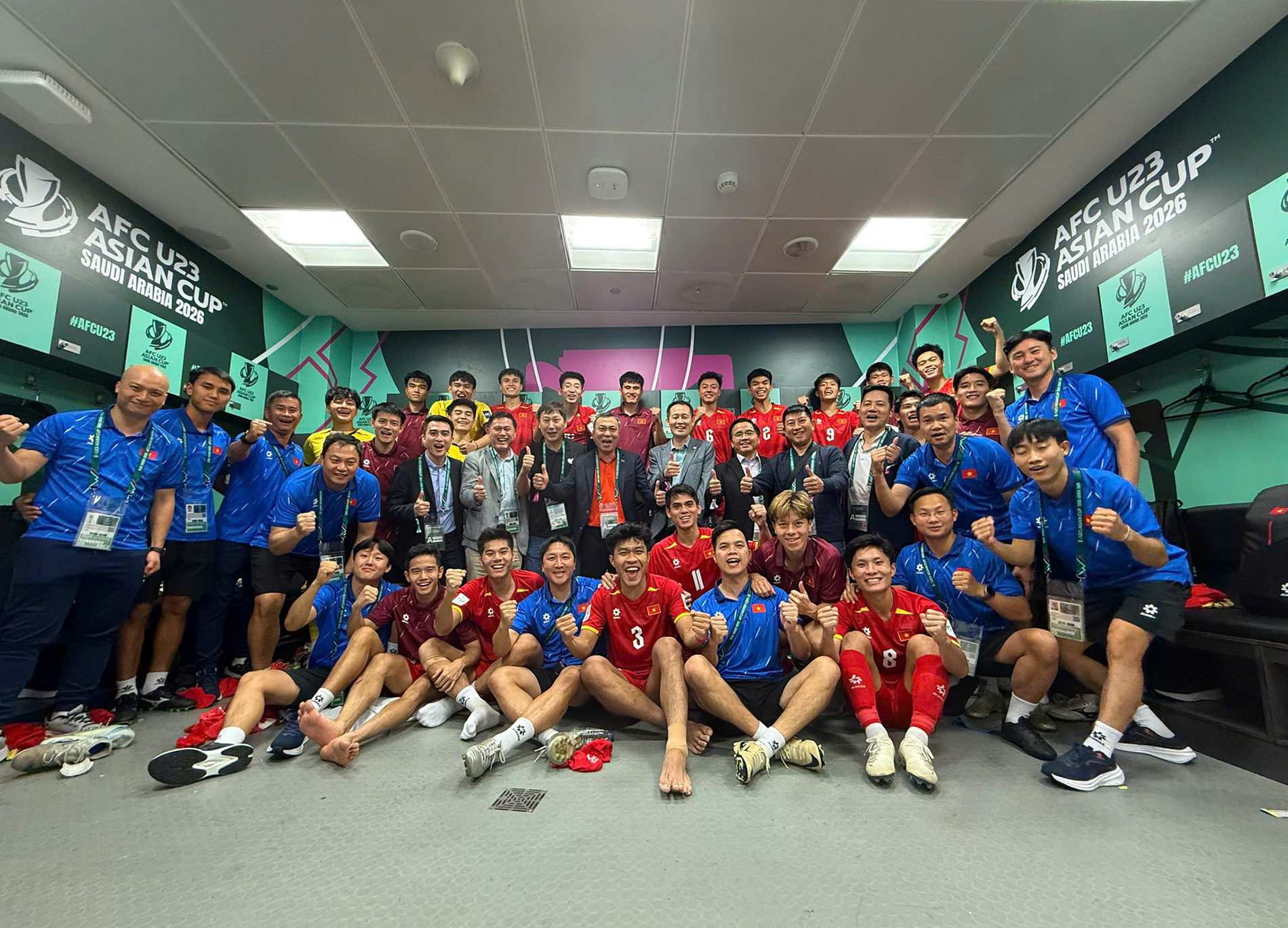Kết thúc trận đấu với U23 Kyrgyzstan, Chủ tịch Liên đoàn Bóng đá Việt Nam (VFF) Trần Quốc Tuấn và các Ủy viên Ban Chấp hành VFF đã gặp gỡ, chúc mừng chiến thắng của đội tuyển U23 Việt Nam.
