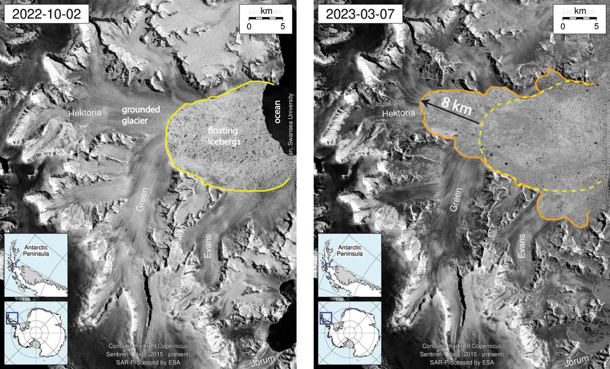 Theo nghiên cứu được công bố đầu tuần này trên tạp chí Nature Geoscience, các sông băng nằm trên mặt đất như Hektoria, nằm dưới đáy biển và không nổi, thường tan chảy không quá vài trăm mét mỗi năm. Nhưng từ tháng 11 đến tháng 12/2022, Hektoria đã tan chảy 8 km.
