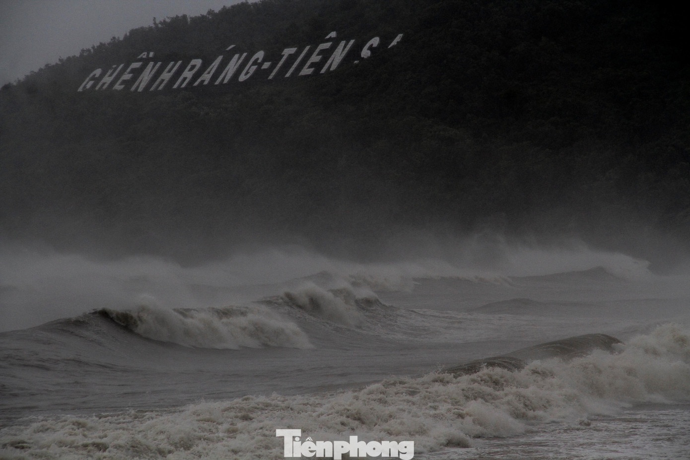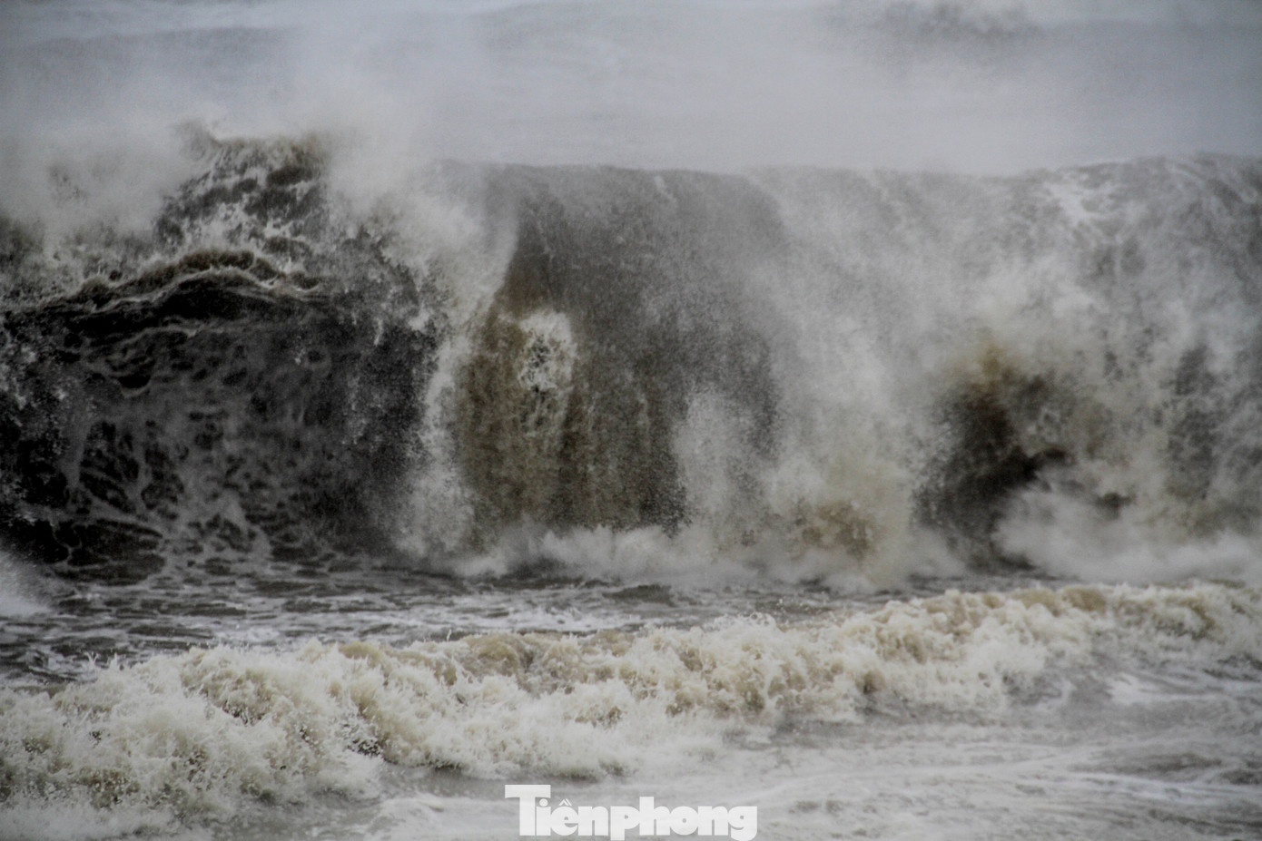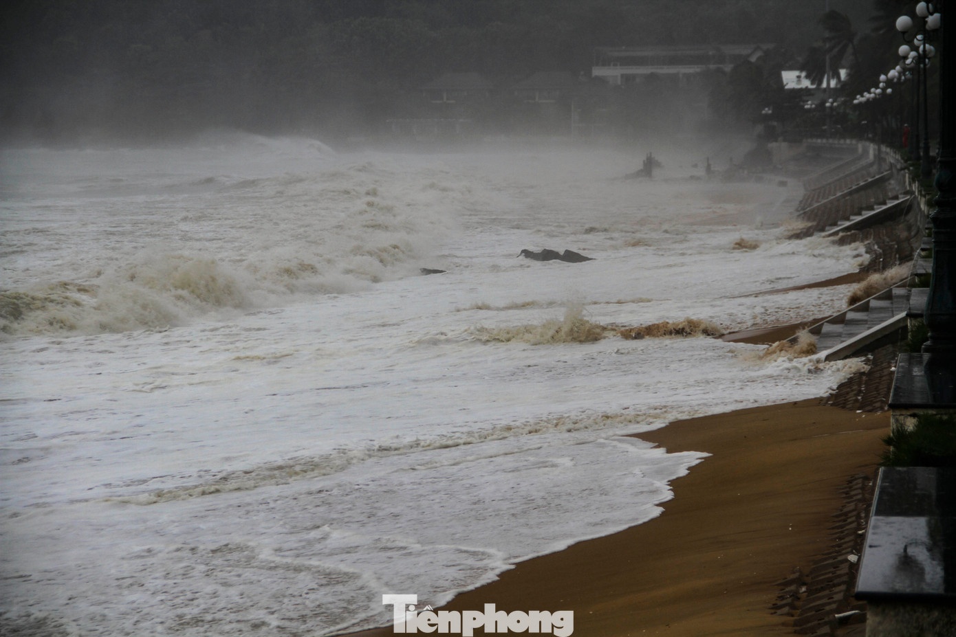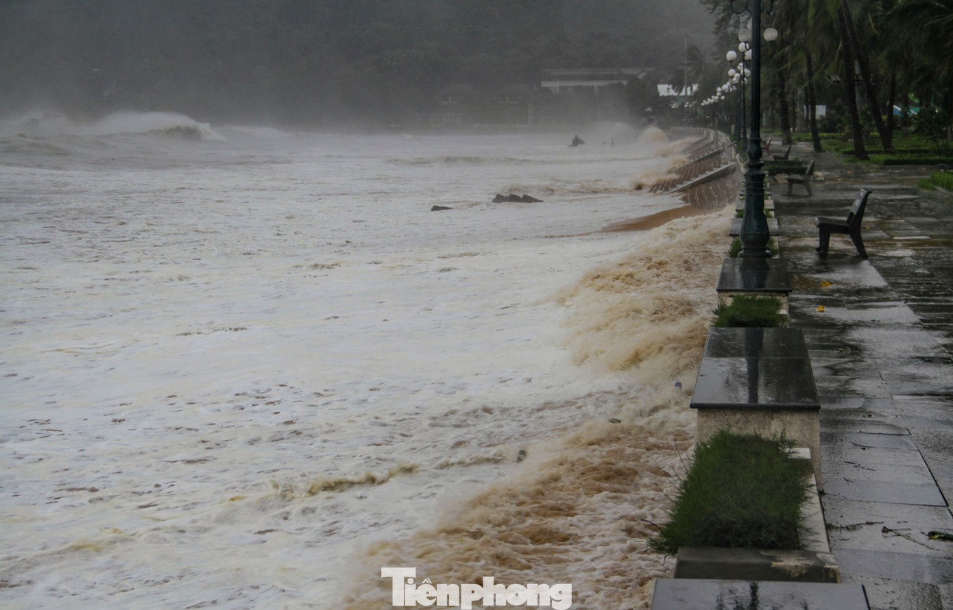Bầu trời đen kịt, sóng biển dâng cao liên tục ập vào bờ.