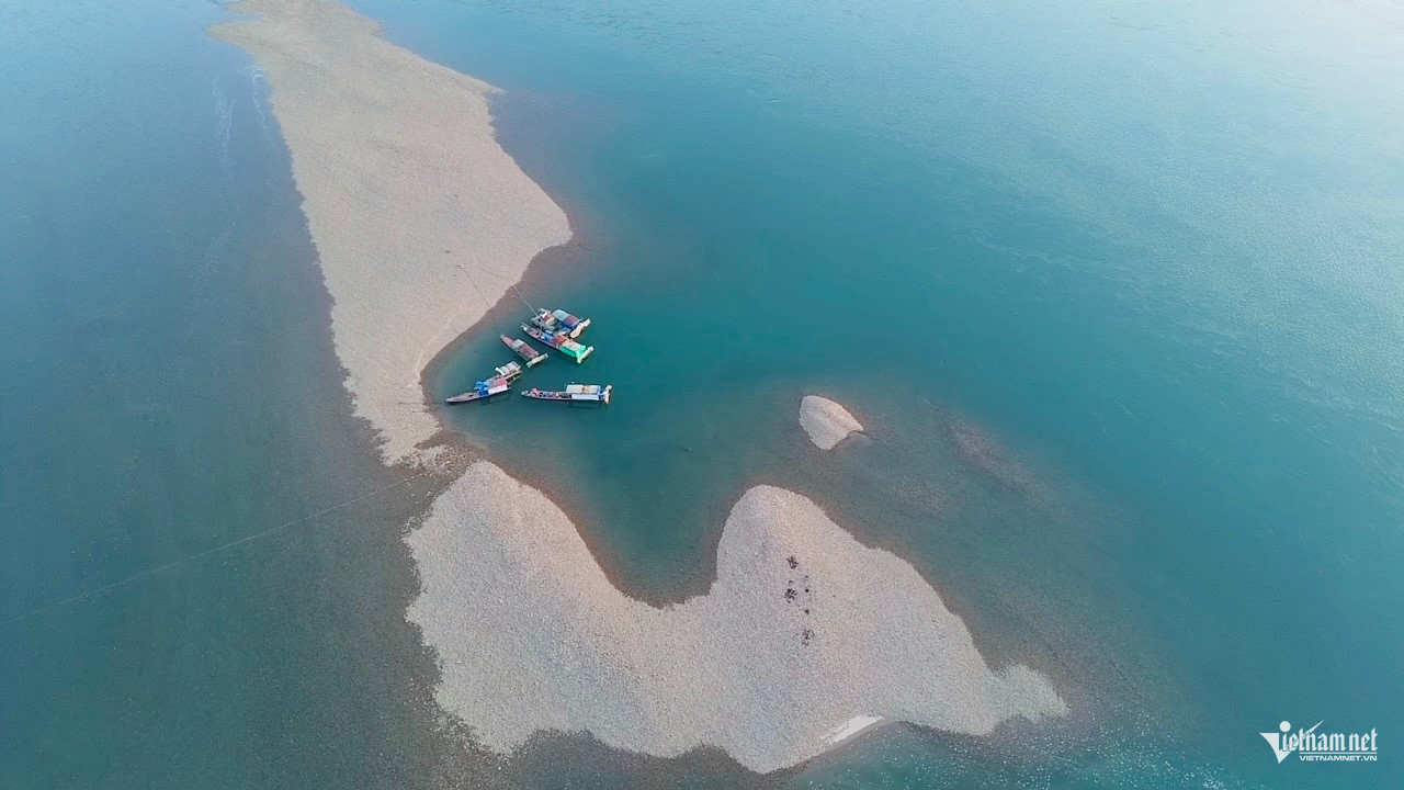 Việc nước rút sâu khiến hàng loạt cồn cát nổi lên giữa lòng sông. Dưới ánh nắng, những dải cát vàng óng uốn lượn trên nền nước xanh thẫm, tạo nên vẻ đẹp hoang sơ hiếm thấy.
