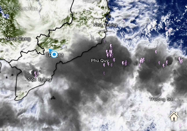 Ảnh mây vệ tinh từ 15 - 16h ngày 17/11, có một rãnh thấp cùng khối mây khổng lồ đang tiến vào khu vực Nam Khánh Hòa, dự báo sẽ gây mưa rất to trong đêm 17/11.