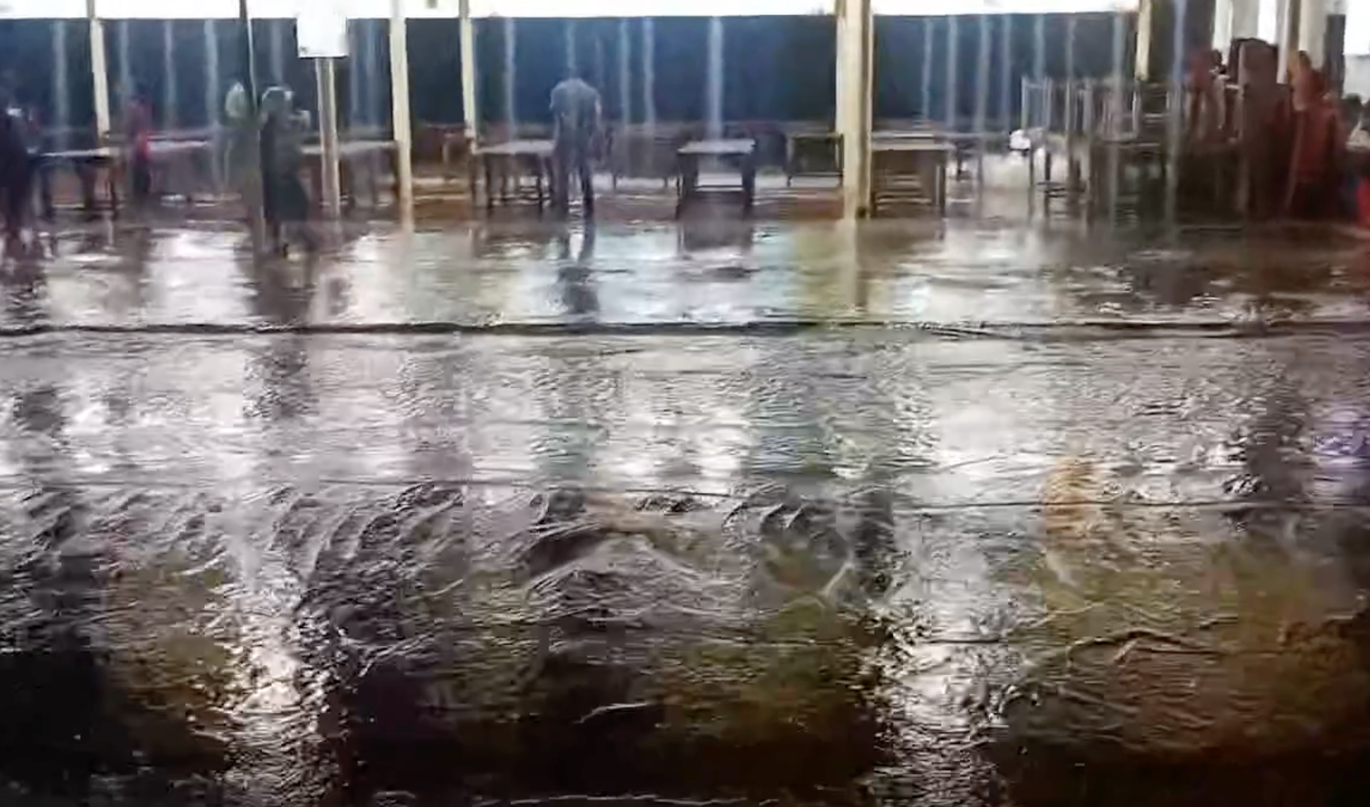 Nước biển tràn vào quán ăn, lan ra đường lớn tối 27/11. Ảnh: Hàn Lập.
