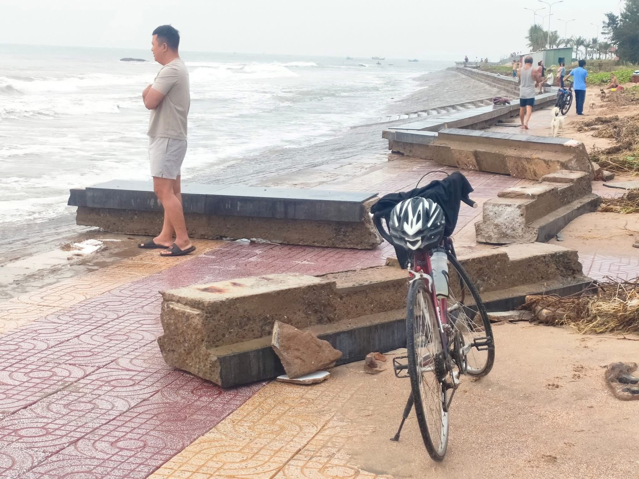 "Gần bão sóng dữ quá. Sóng đánh một đêm mà mọi thứ gãy nứt thế này. Tối qua tôi có đi qua đoạn đường này nhưng không ngờ sóng lại dữ dội như thế", chị Dương nói.