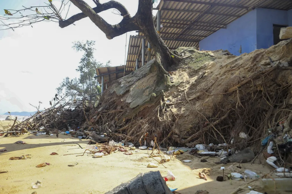 Hệ thống cây xanh phòng hộ ven biển cũng bị bật gốc. Những bộ rễ cây phi lao, dừa vốn bám sâu vào lòng đất để giữ cát nay trơ trọi trước những con sóng bạc đầu.