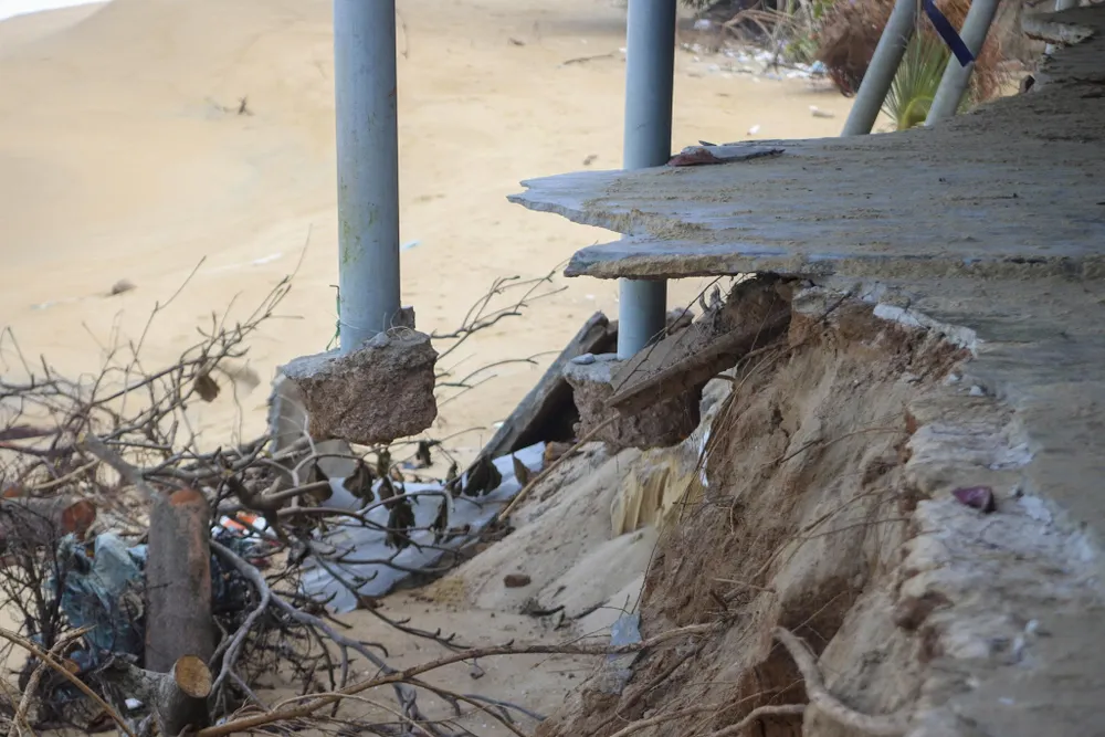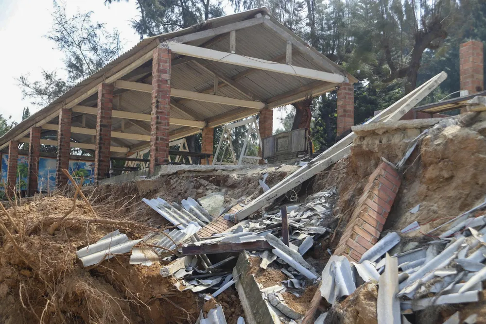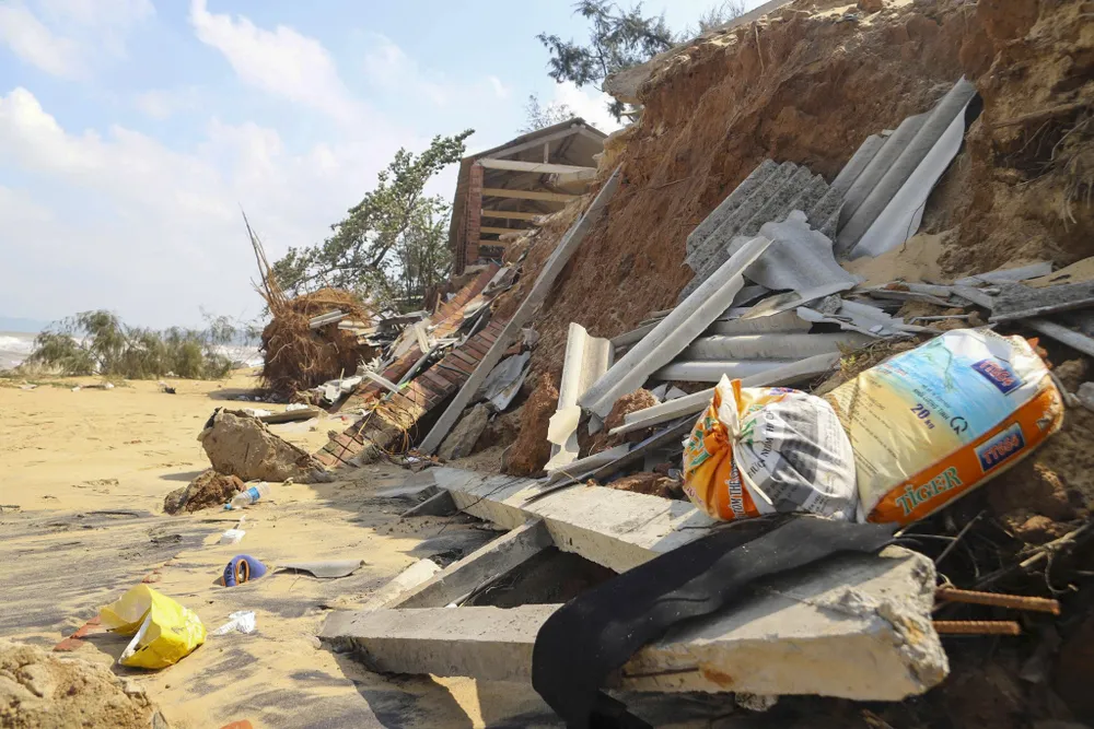 Hàng loạt công trình kiên cố, hàng quán kinh doanh của người dân nằm sát bờ biển không chịu nổi sức tàn phá của sóng dữ đã bị đánh sập, gạch đá nằm ngổn ngang lẫn trong rác thải trôi dạt.