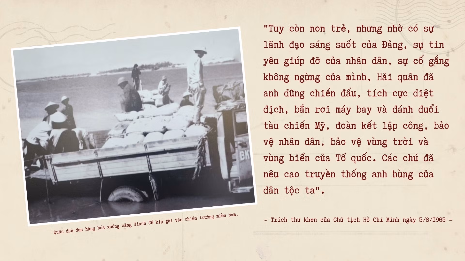 Tự hào, những chiến công đặc biệt này đã được Chủ tịch Hồ Chí Minh gửi thư khen ngợi vào ngày 5/8/1965, nhân dịp kỷ niệm một năm chiến thắng trận đầu: “Tuy còn non trẻ, nhưng nhờ có sự lãnh đạo sáng suốt của Đảng, sự tin yêu giúp đỡ của nhân dân, sự cố gắng không ngừng của mình, Hải quân đã anh dũng chiến đấu, tích cực diệt địch, bắn rơi máy bay và đánh đuổi tàu chiến Mỹ, đoàn kết lập công, bảo vệ nhân dân, bảo vệ vùng trời và vùng biển của Tổ quốc. Các chú đã nêu cao truyền thống anh hùng của dân tộc ta”.