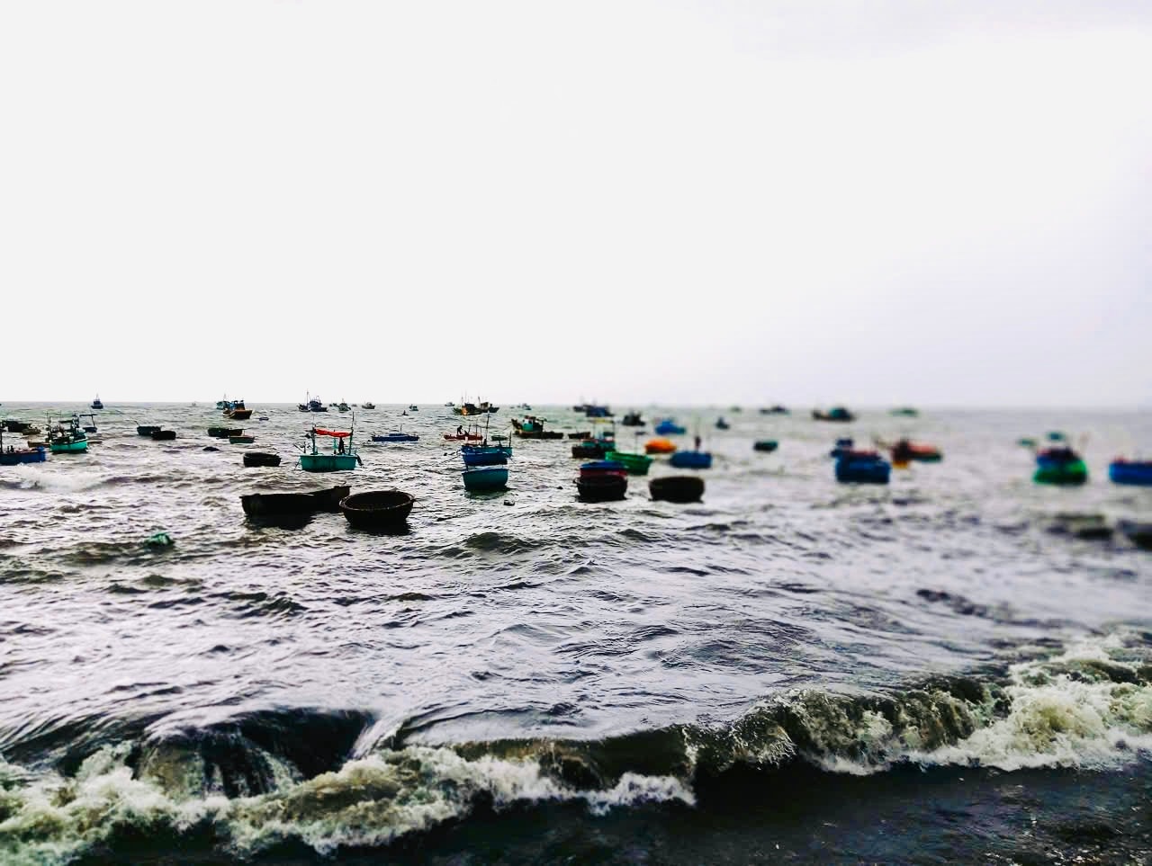 Sóng lớn nên các thuyền thúng nhanh chóng vào bờ đảm bảo an toàn