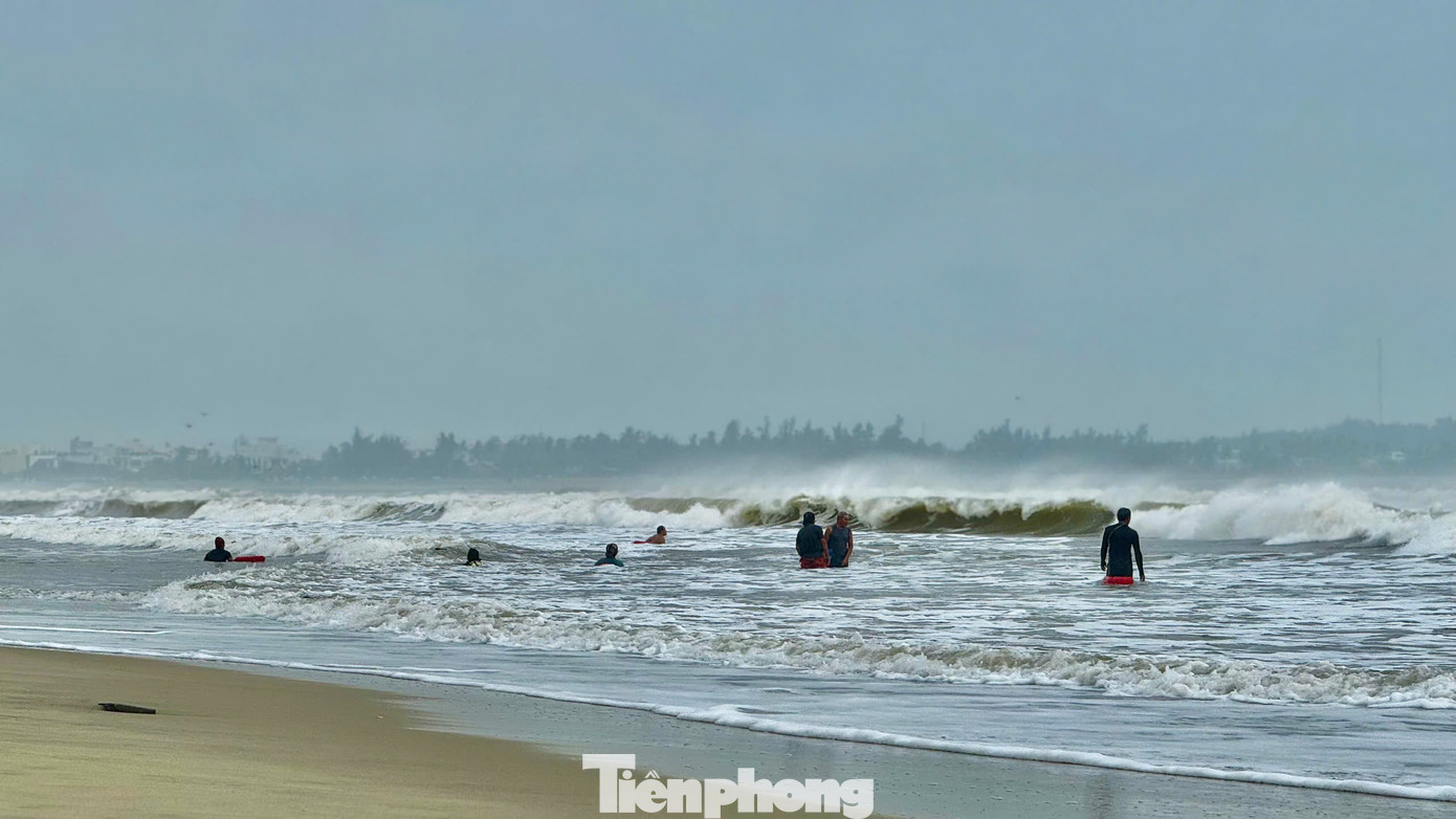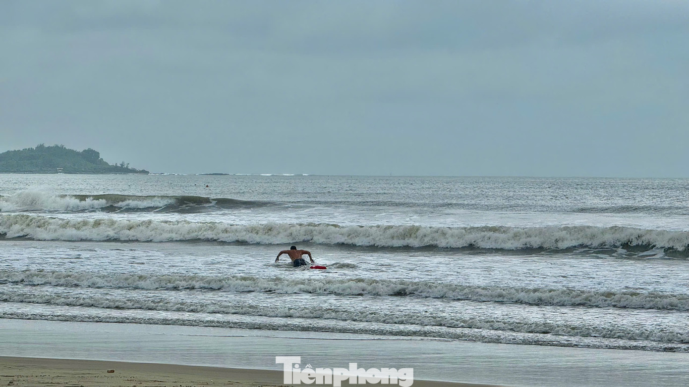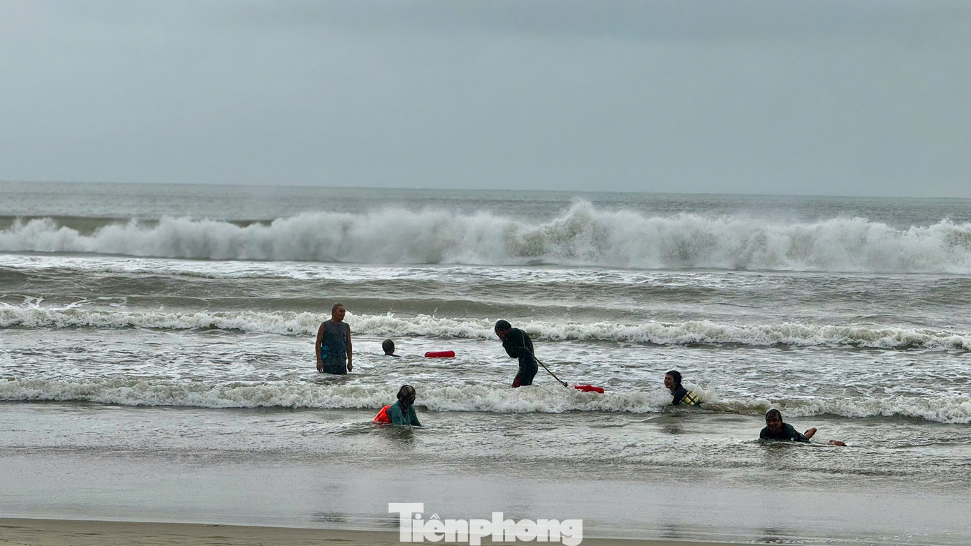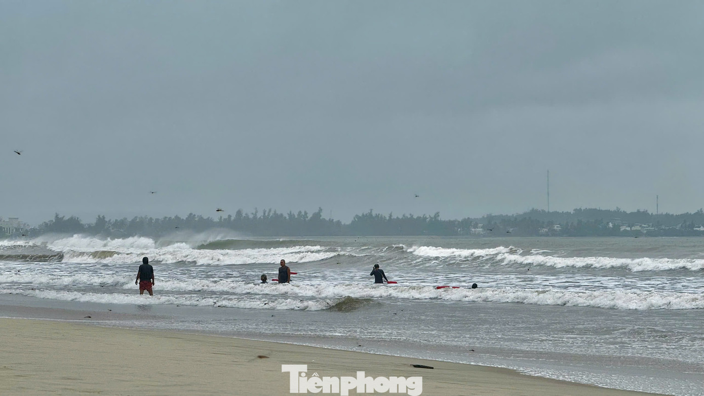 Ghi nhận của phóng viên Tiền Phong, khoảng 16h chiều cùng ngày, khi gió bắt đầu mạnh dần, mưa mỗi lúc một nặng hạt, sóng biển cao từ 1–2m liên tục xô bờ, nhiều người dân vẫn nô đùa, bơi lội ngay khu vực bãi tắm chính, giữa nền trời xám xịt, gió quất tung bọt biển.