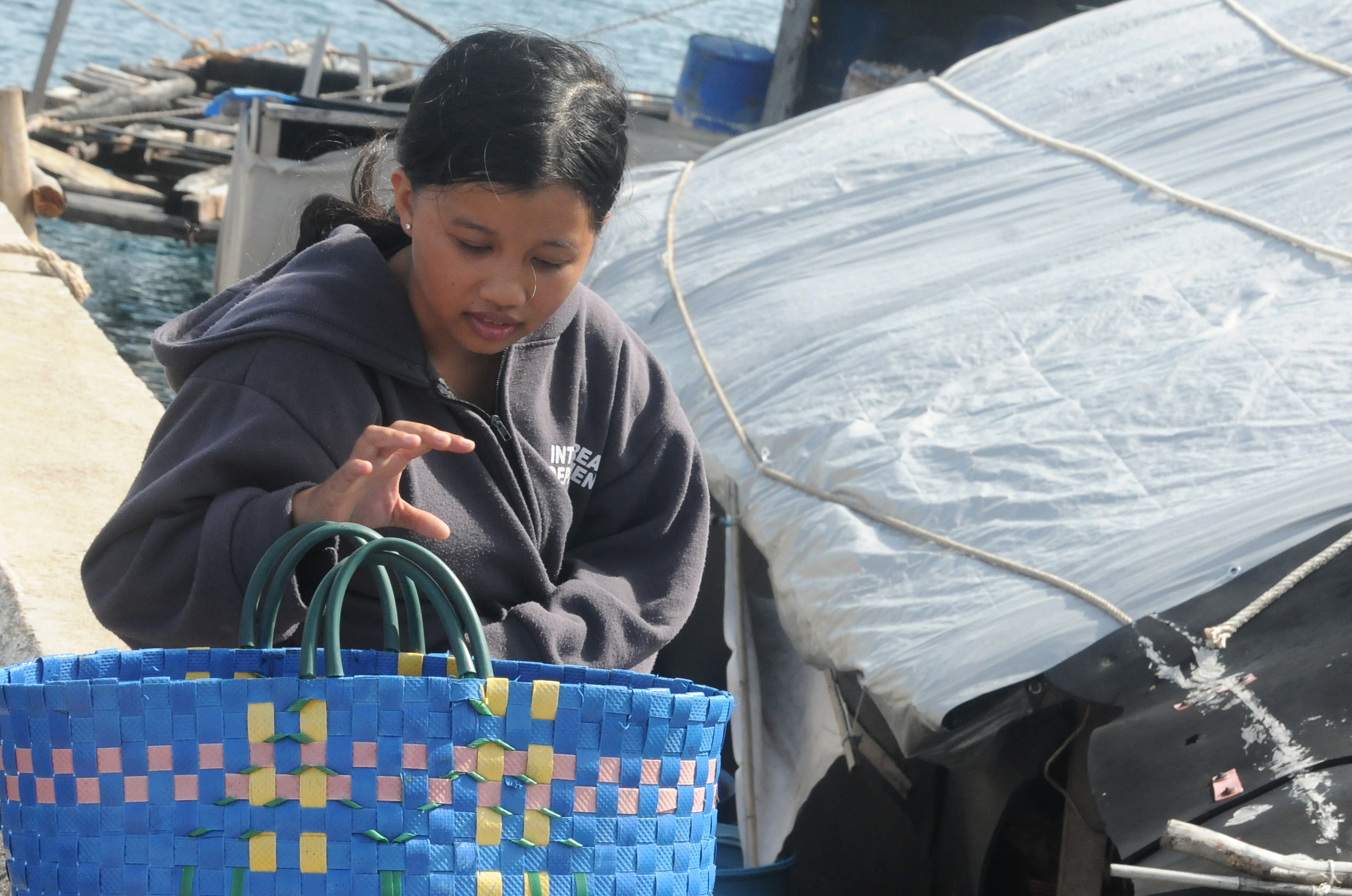 Em Nguyễn Thúy An, lớn lên ở xóm chạy gió. Hằng ngày, em phụ gia đình đem cá vịt biển ra chợ Thổ Châu bán. Ảnh: Đào Văn