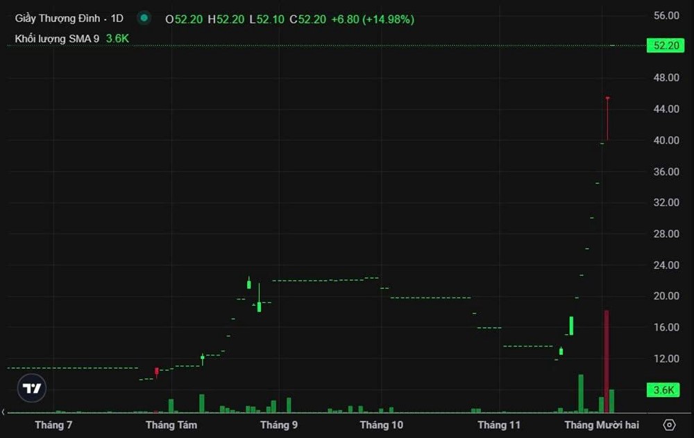 Nổi bật trong số này là Công ty CP Giầy Thượng Đình (UPCoM: GTD). Ngay sau khi UBND TP. Hà Nội công bố kế hoạch đấu giá toàn bộ hơn 4,39 triệu cổ phiếu vào ngày 16/12, giá cổ phiếu GTD lập tức tăng trần và duy trì sắc tím đến cuối tháng 11. Bước sang tháng 12, sức nóng của mã này chưa hạ nhiệt khi tính đến ngày 2/12, GTD tiếp tục nối dài chuỗi tăng trần sang phiên thứ 10 liên tiếp, khối lượng khớp lệnh tăng vọt lên hơn 16.000.