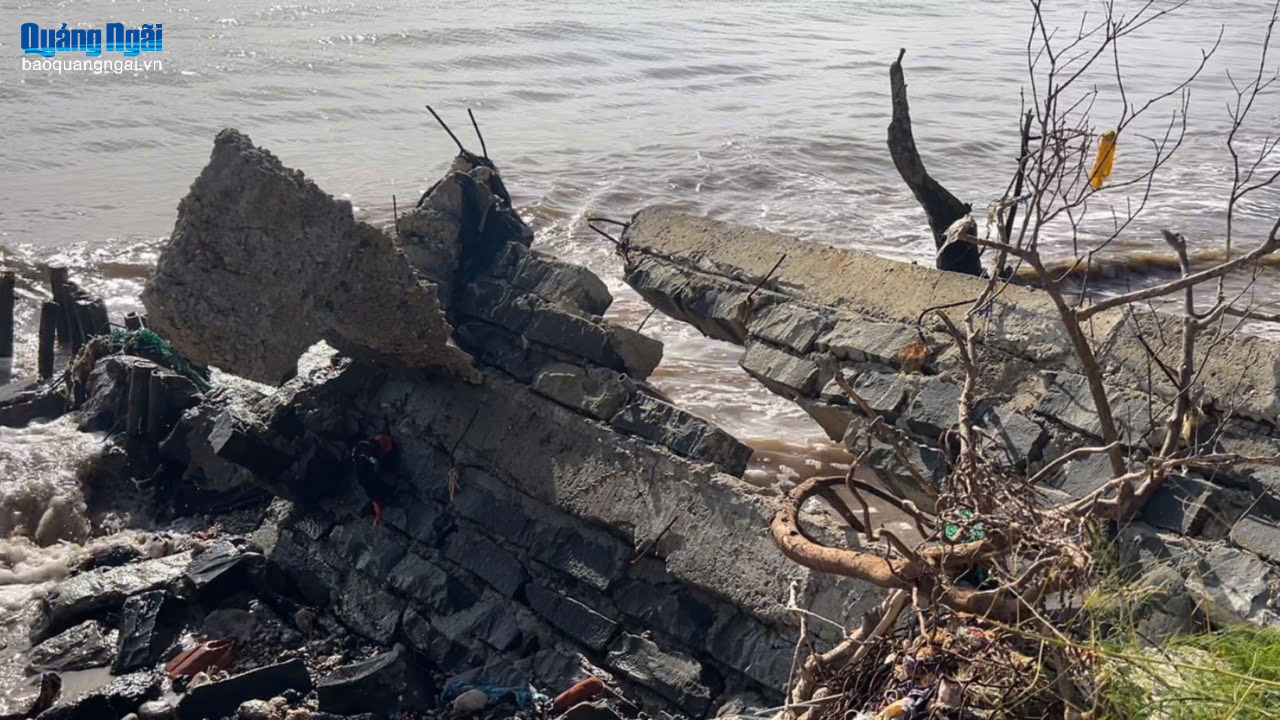 Nhiều đoạn kè tạm người dân tự xây đã bị sóng đánh nát.
