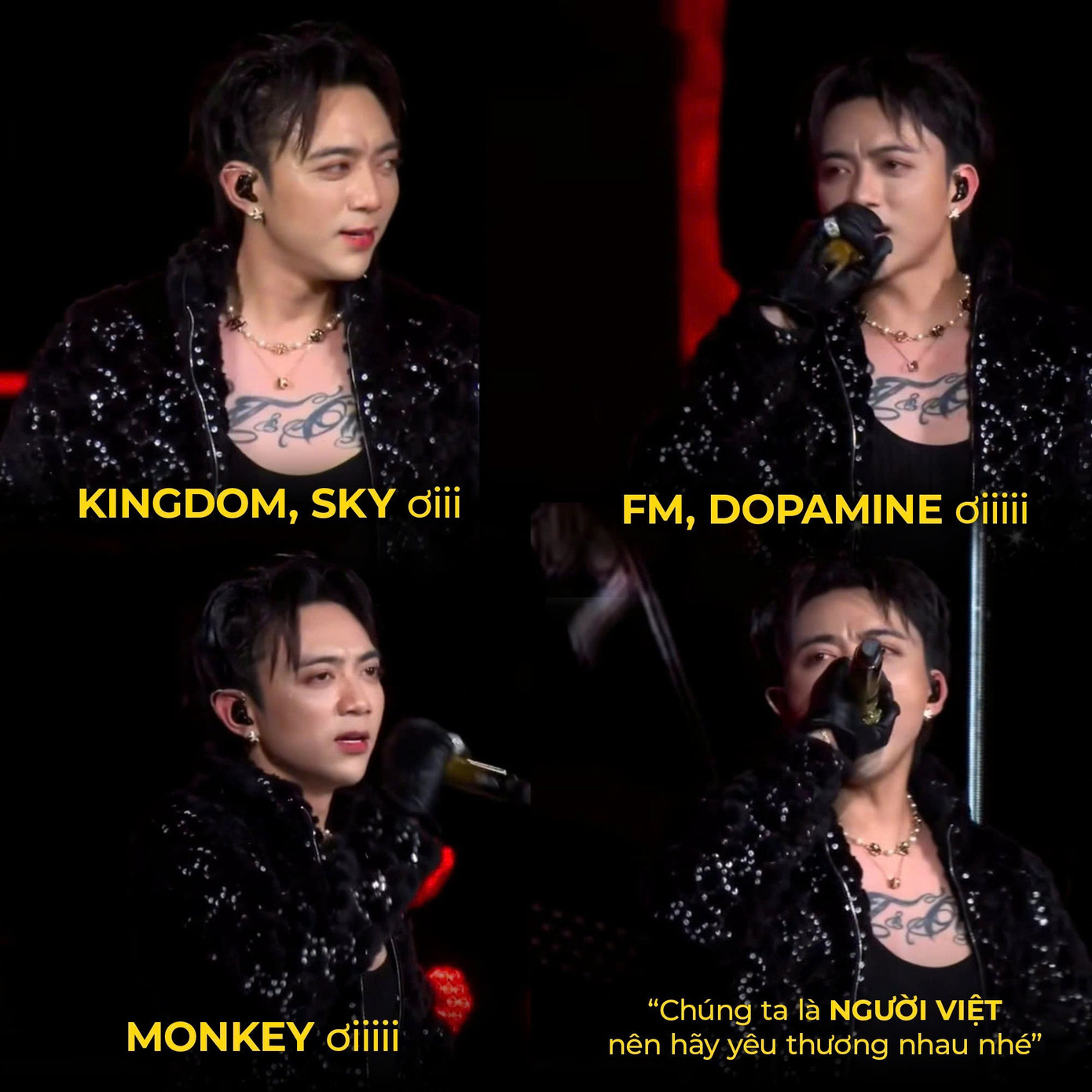 Kết thúc phần trình diễn, bất ngờ dừng lại và gửi lời nhắn tới khán giả: “Chúng ta là người Việt Nam, nên hãy luôn yêu thương nhau nhé! Kingdom ơi, Sky ơi, Monkey ơi, Dopamine ơi - tất cả hãy cùng yêu thương nhau.”