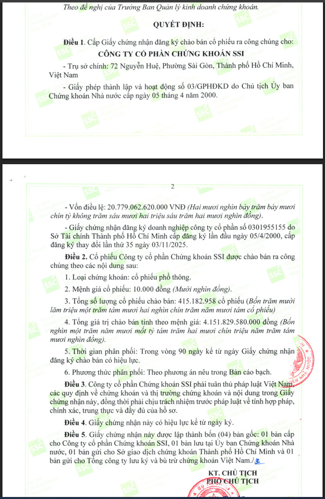 SSI cho biết, doanh nghiệp đã được UBCKNN cấp giấy chứng nhậnchào bán cổ phiếu ra công chúng. Số cổ phiếu chào bán là hơn 415 triệu đơn vị,tương ứng tổng giá trị theo mệnh giá hơn 4.151 tỷ đồng.