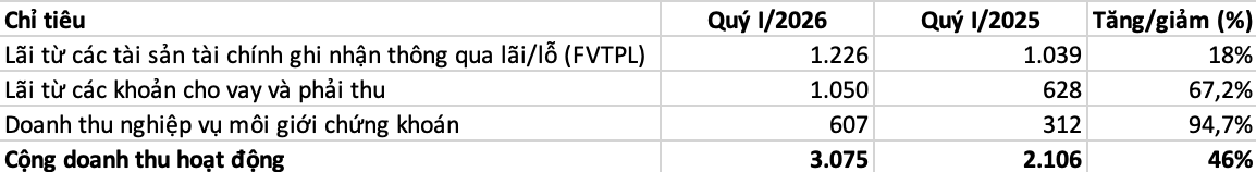 Xét theo cơ cấu hoạt động, mảng dịch vụ chứng khoán tiếp tục đóng vai trò trụ cột. Trong đó, doanh thu từ môi giới, lưu ký và tư vấn đầu tư đạt 633 tỷ đồng, tăng mạnh 93% so với cùng kỳ. Thị phần môi giới cổ phiếu, chứng chỉ quỹ và chứng quyền có bảo đảm trên HOSE đạt 11,14%, cải thiện đáng kể so với mức 9,93% cùng kỳ năm trước. Ở mảng phái sinh, thị phần cũng tăng lên 7,2% từ mức 3,11%. Hoạt động cho vay ký quỹ và ứng trước tiền bán tiếp tục ghi nhận tăng trưởng tích cực, với doanh thu gần 1.050 tỷ đồng, tăng 67% so với cùng kỳ.