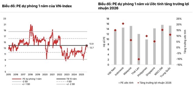 Dù đã ghi nhận đà tăng mạnh trong năm 2025, định giá toàn thị trường vẫn được xem là hợp lý. VN-Index hiện giao dịch ở mức P/E dự phóng 2025 và 2026 lần lượt là 13,9 và 12 lần, thấp hơn trung bình 10 năm (14 lần) và dưới đáng kể so với giai đoạn thị trường hưng phấn trước đây (15 - 16 lần).