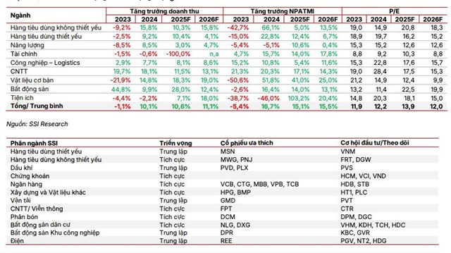 Nhóm tiêu dùng và bán lẻ được kỳ vọng phục hồi nhờ thu nhập khả dụng tăng, nổi bật với MWG, PNJ và FRT.Các chủ đề bất động sản và hạ tầng vẫn duy trì sức hấp dẫn nhờ đầu tư công, trong đó vật liệu xây dựng như HPG và BMP là nhóm được ưu tiên.