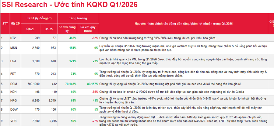 SSI Research vừa công bố báo cáo ước tính kết quả kinh doanh quý I/2026 của khoảng 40 doanh nghiệp niêm yết, với nhiều điểm đáng chú ý.