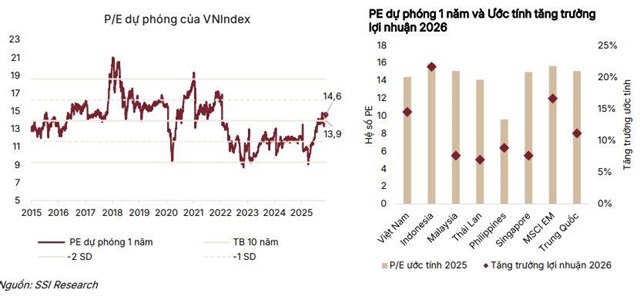 Về định giá thị trường cổ phiếu vẫn hấp dẫn, SSI Research kỳ vọng VN-Index có thể đạt 1.920 điểm nhờ tăng trưởng lợi nhuận dự báo đạt 14,5% trong năm 2026, vượt trội so với các thị trường trong khu vực. P/E dự phóng 2026 hiện ở mức 12,7x, thấp hơn mức trung bình lịch sử.