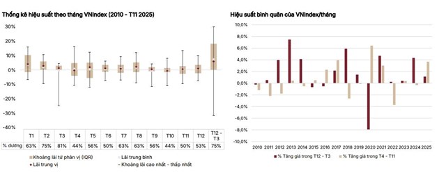Tại khoảng thời gian này, xác suất thị trường tăng điểm đạt khoảng 75%, cao hơn đáng kể so với mức 50% trong giai đoạn tháng 4 - tháng 11. Mức sinh lời bình quân của tháng trong giai đoạn tháng 12 - tháng 3 đạt 1,7%, cao hơn rõ rệt so với 0,5%/tháng trong giai đoạn tháng 4 - tháng 11.