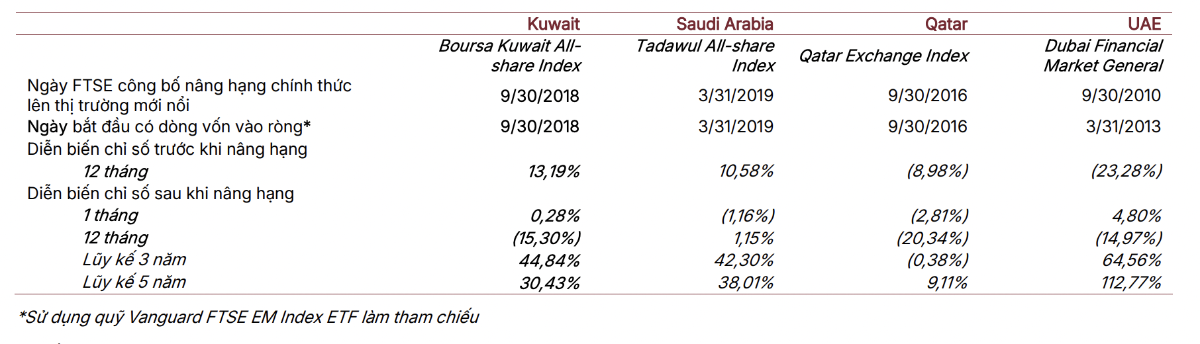 Ngoài ra, SSI Research cũng hực hiện nghiên cứu và so sánh về tỷ suất sinh lời của thị trường chứng khoán tại các quốc gia từng được FTSE nâng hạng từ Thị trường Cận biên (Frontier Market) lên Thị trường Mới nổi (Emerging Market). Kết quả cho thấy các thị trường này thường ghi nhận mức sinh lời vượt trội trong trung hạn.