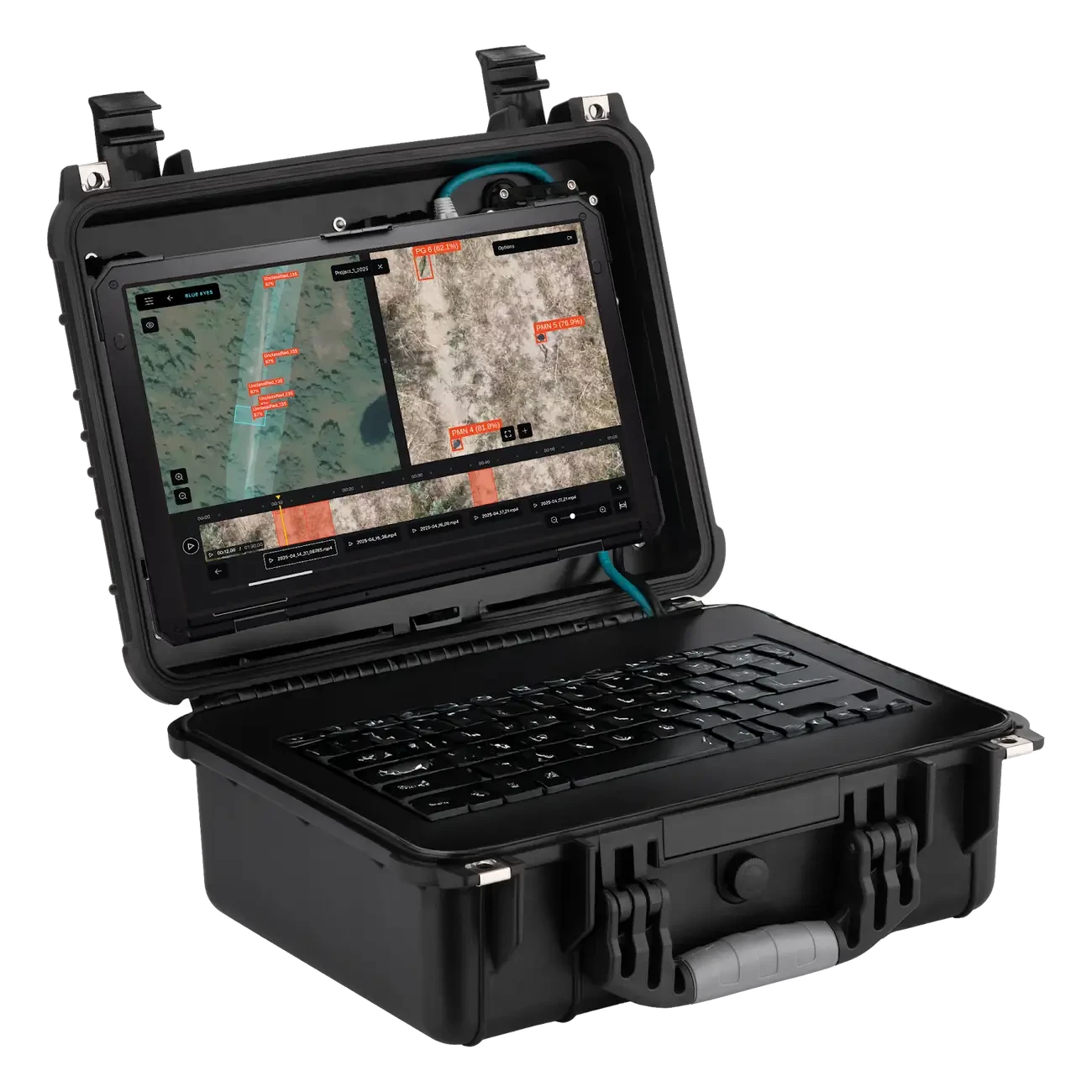 Phiên bản Blue Eyes cơ bản nhất gồm một hộp kim loại nặng 2,1 kg chứa phần mềm, được kết nối với các trạm chỉ huy – điều khiển của Ukraine. Phần mềm này hoạt động được với bất kỳ drone nào tích hợp camera, nhưng cũng có thể được bán kèm drone và phần cứng điều khiển.