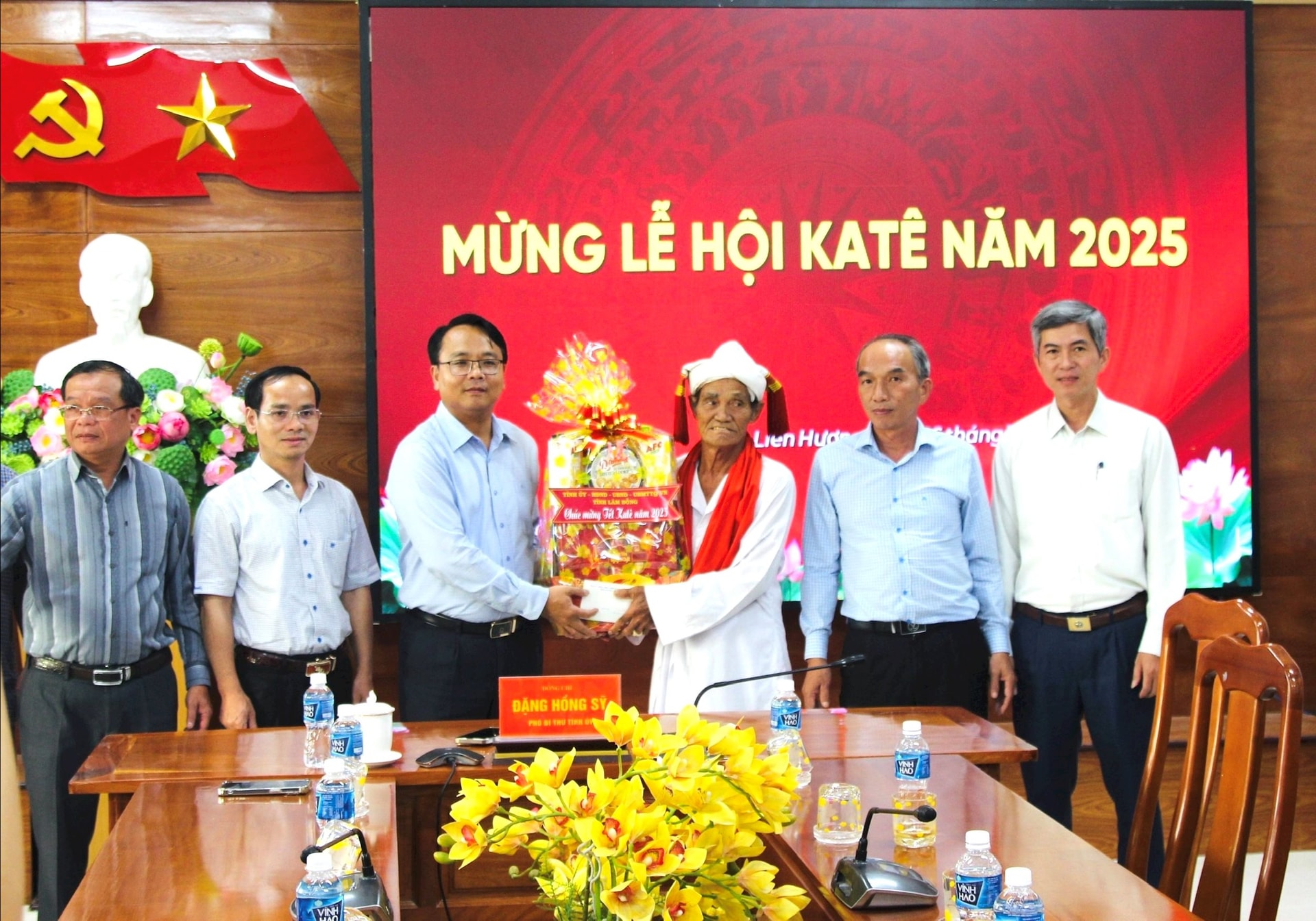 Phó Bí thư Thường trực Tỉnh ủy Đặng Hồng Sỹ tặng quà cho Sư cả Thường Xuân Hữu nhân dịp Tết Katê năm 2025