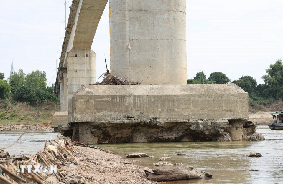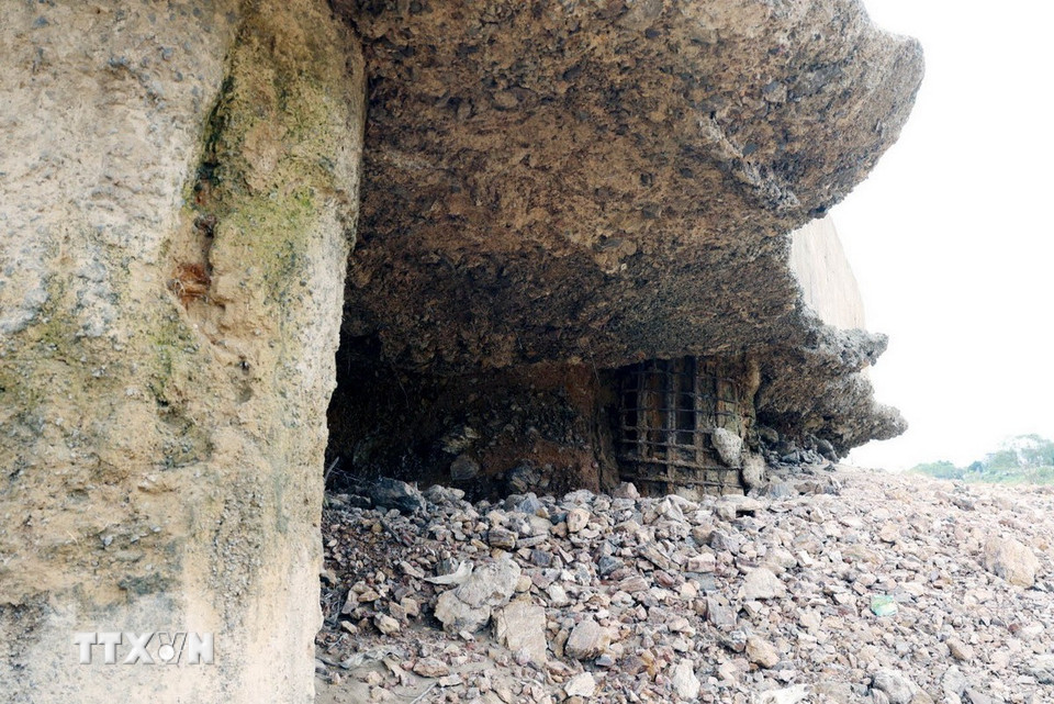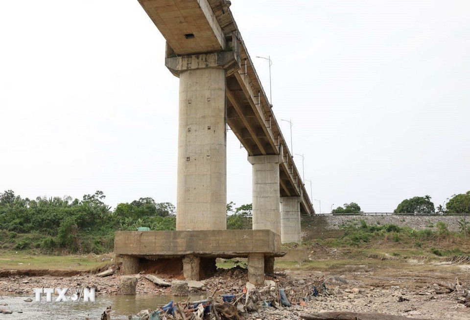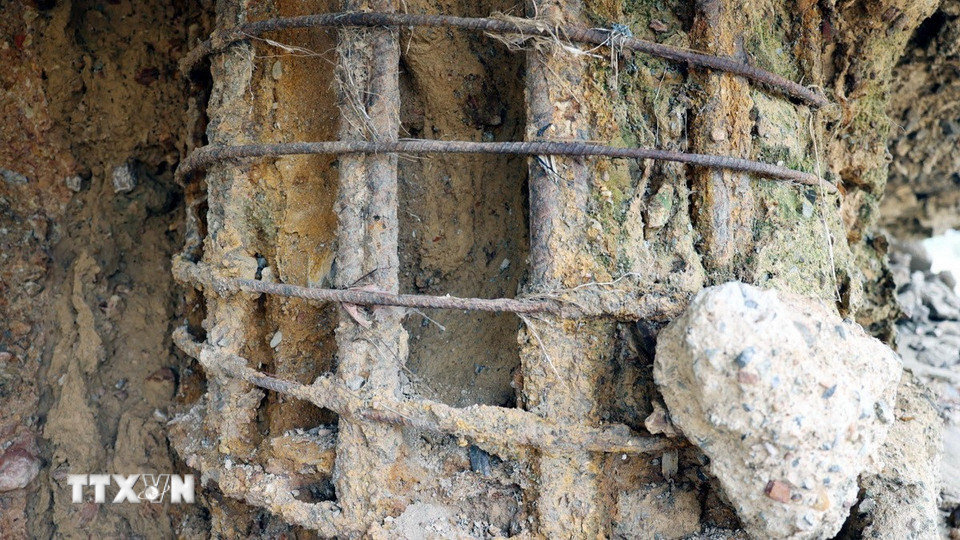 Trụ T3 của cầu sông Lô bị hư hỏng, lộ nguyên phần bêtông, cốt thép dưới chân cầu. (Ảnh: Tạ Toàn/TTXVN)