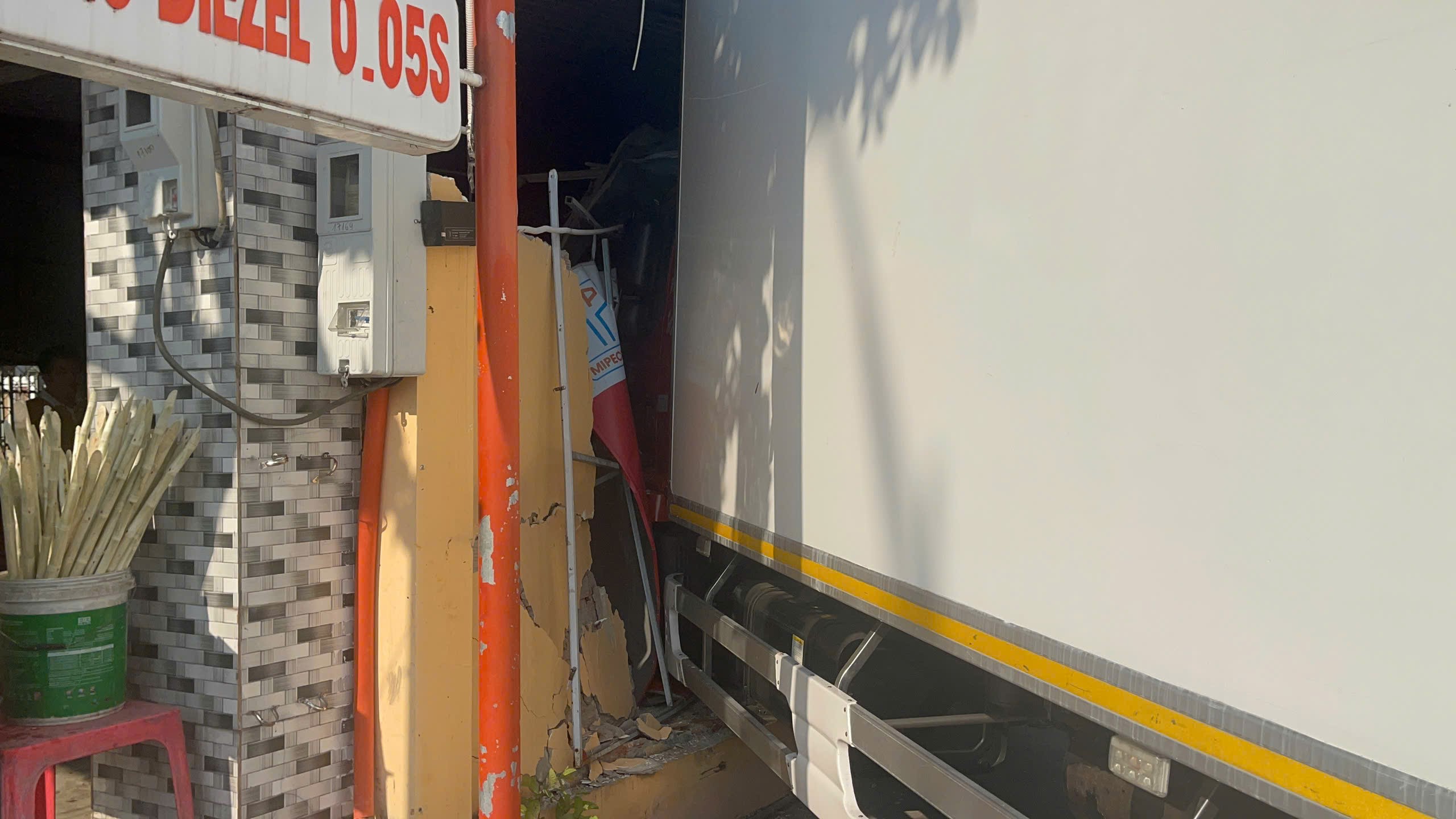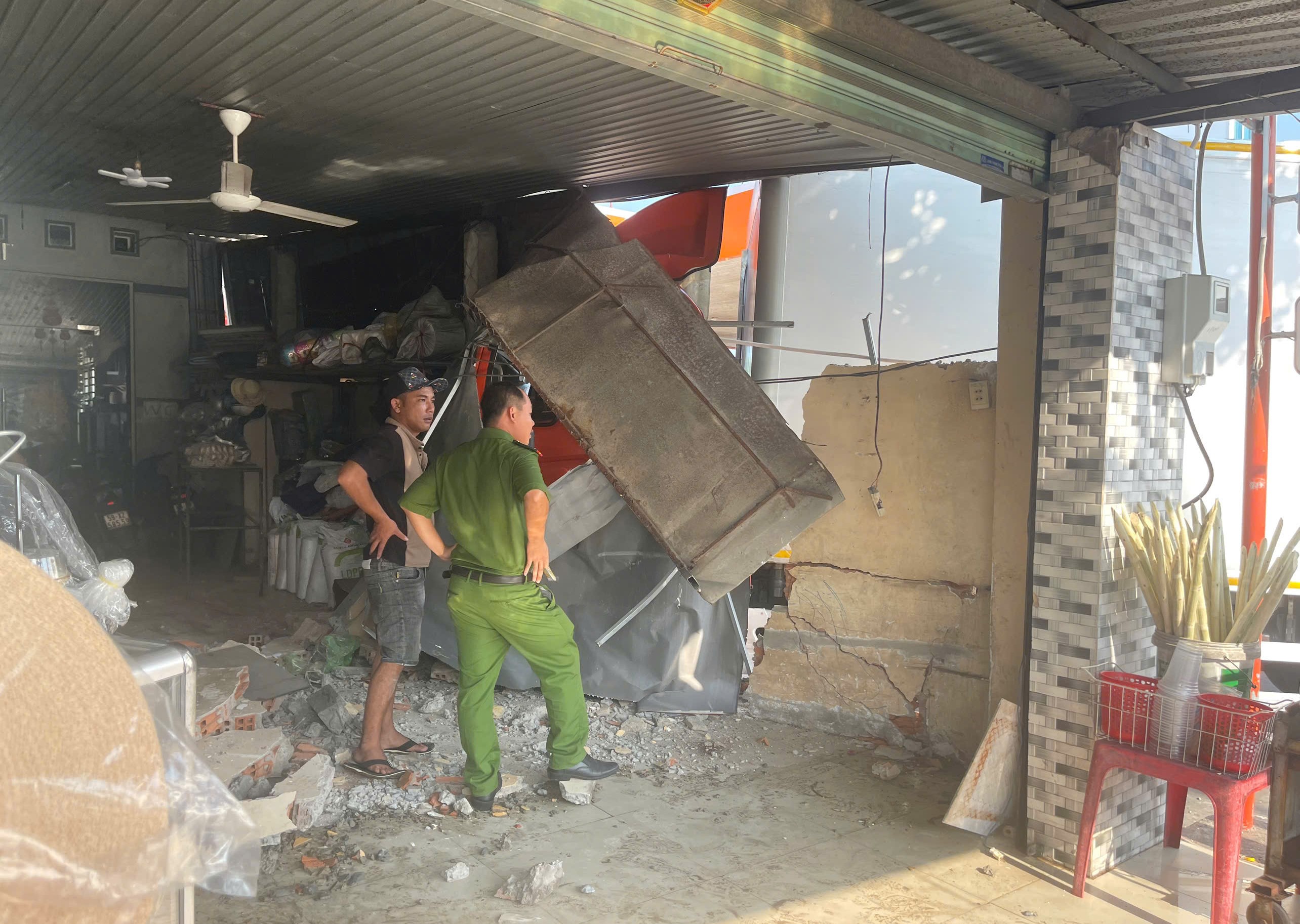 Vụ va chạm khiến tường nhà đổ sập, rất may không gây thương vong về người.