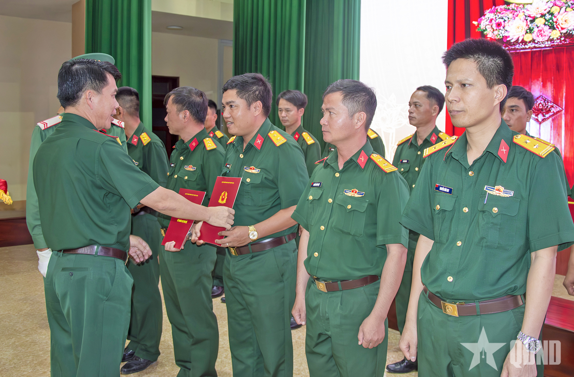Đại tá Hồ Sỹ Chiến, Bí thư Đảng ủy, Chính ủy Sư đoàn 10 trao quyết định thăng quân hàm, nâng lương cho sĩ quan.
