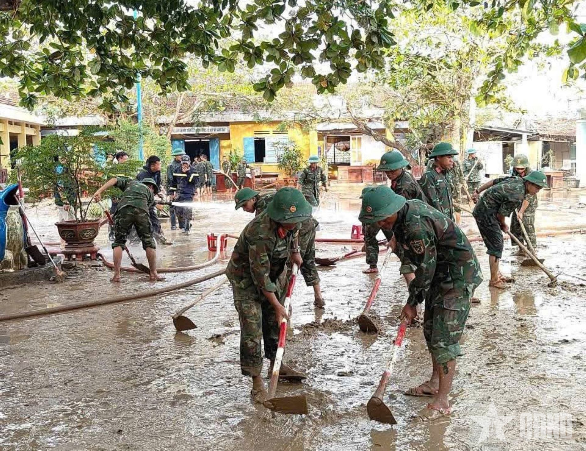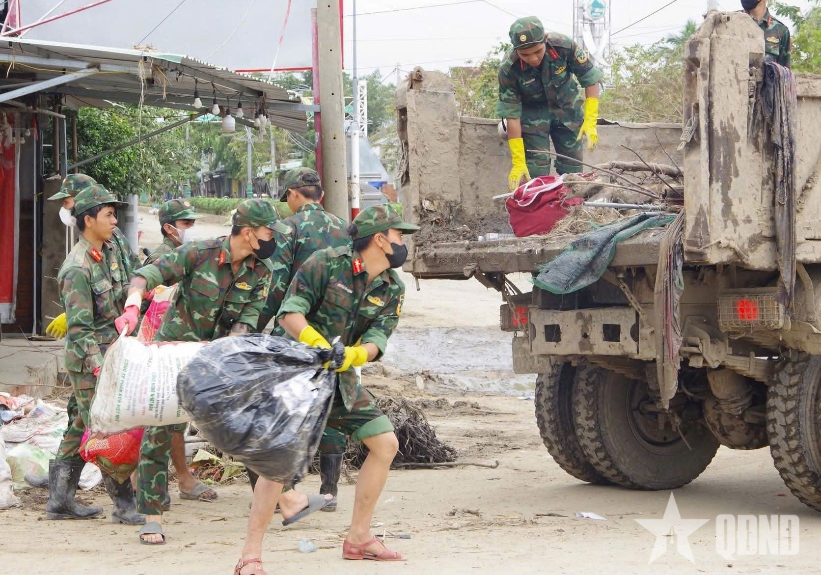 Cán bộ, chiến sĩ Sư đoàn 2 (Quân khu 5) giúp các địa phương khắc phục hậu quả lũ lụt.