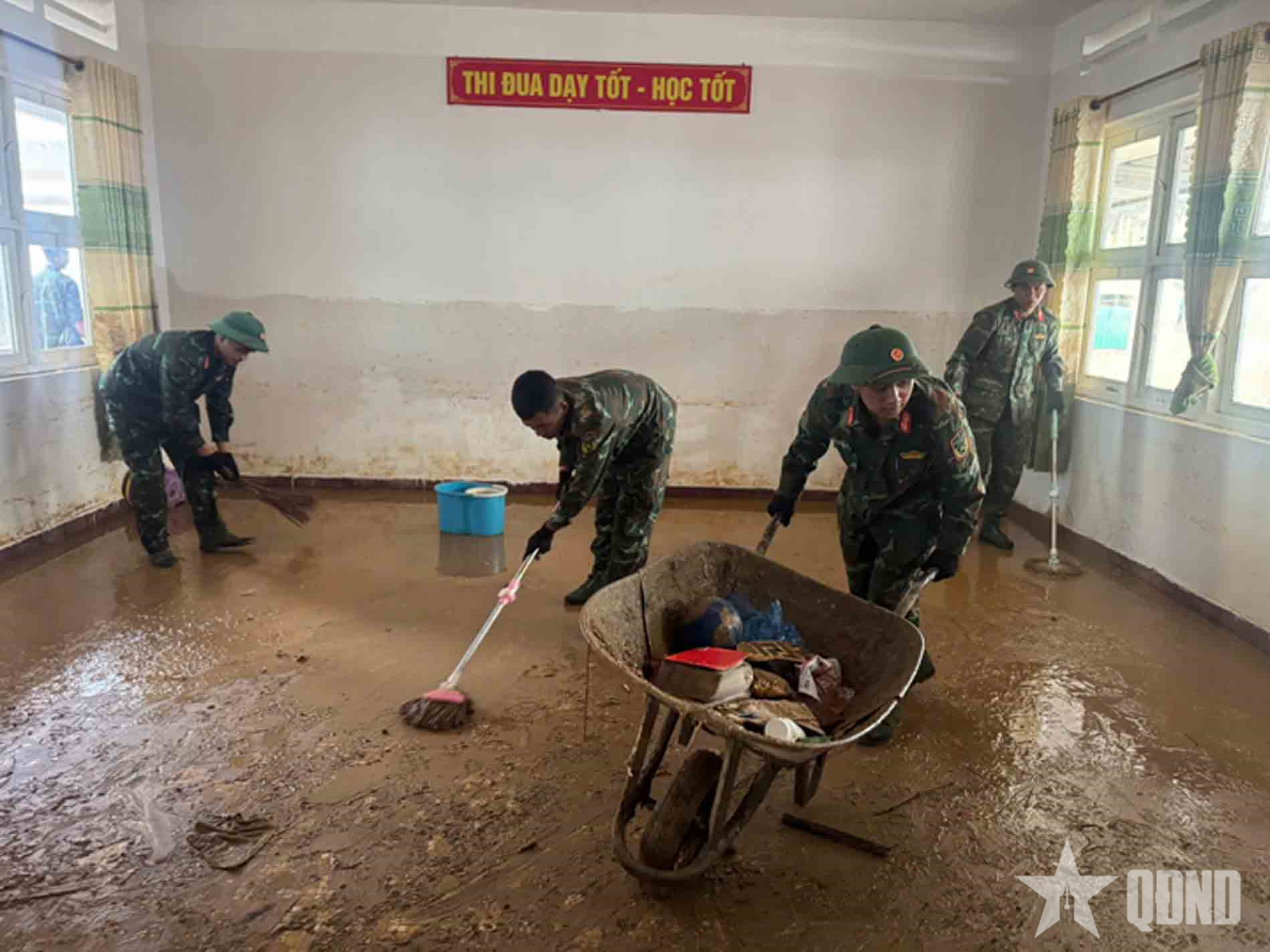 Bộ đội Sư đoàn 302 dọn vệ sinh trường học sau mưa lũ.