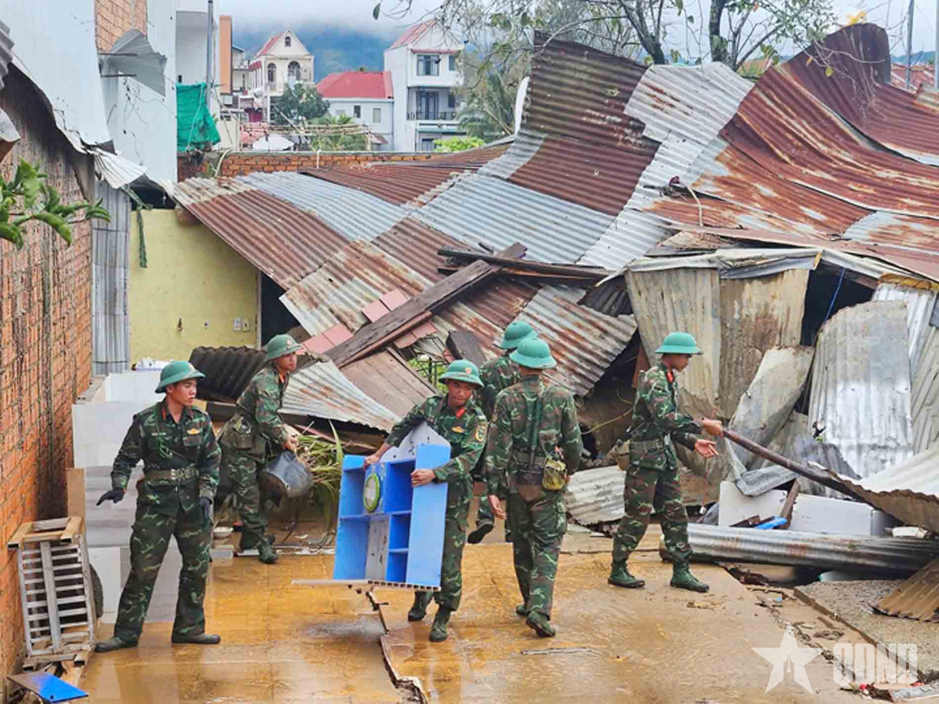 Ở một điểm khác thuộc xã Lạc Dương, Đại úy Nguyễn Trung Kiên, Đại đội trưởng Đại đội Đại đội 9, Tiểu đoàn 6 (Trung đoàn 88, Sư đoàn 302) và cán bộ, chiến sĩ dùng cưa tay và dao tông dọn cây xanh, tôn chắn ngang đường và dọn bùn đất đá rác thải tại các trường học, trong nhà các hộ dân, khi nước rút dần. Đại úy Nguyễn Trung Kiên vừa làm, vừa động viên anh em: “Chậm nhưng chắc. Không ai được mạnh ai nấy làm. Giữ đội hình, phối hợp các lực lượng địa phương dọn vệ sinh đến đâu, sạch đến đó”.