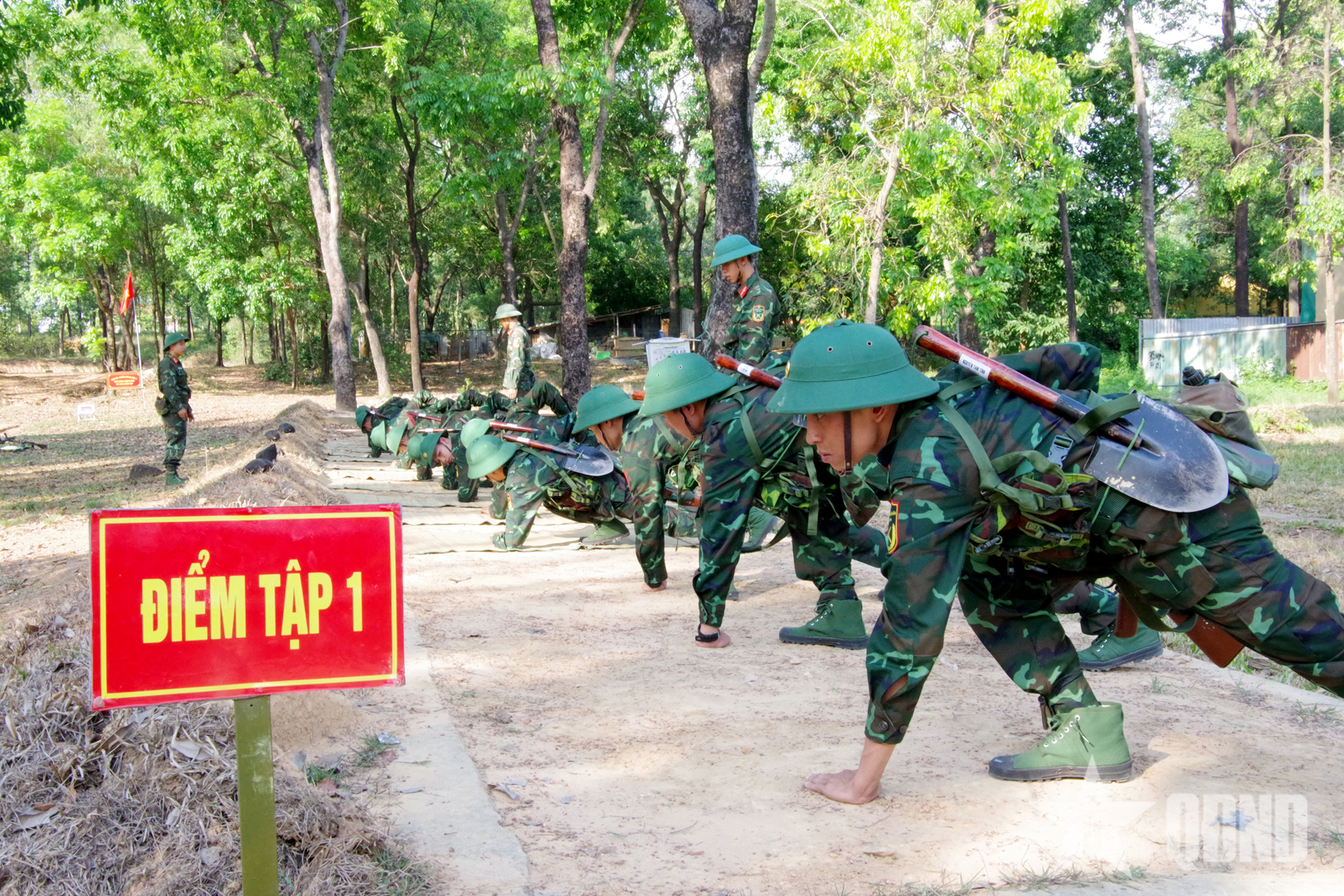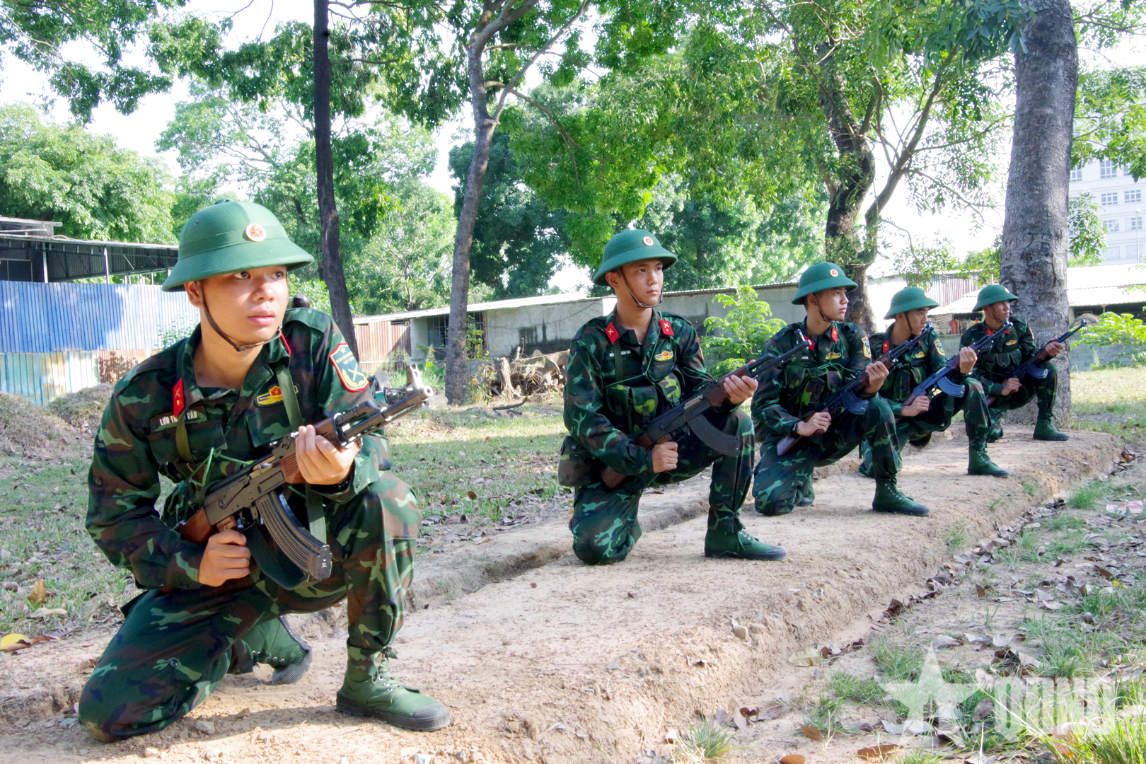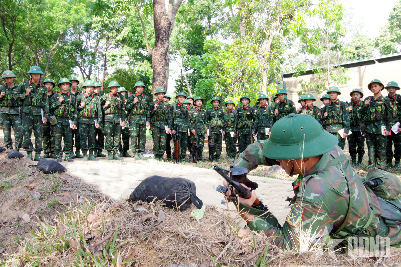 Chiến sĩ mới thực hành động tác nằm bắn theo khẩu lệnh của tiểu đội trưởng.