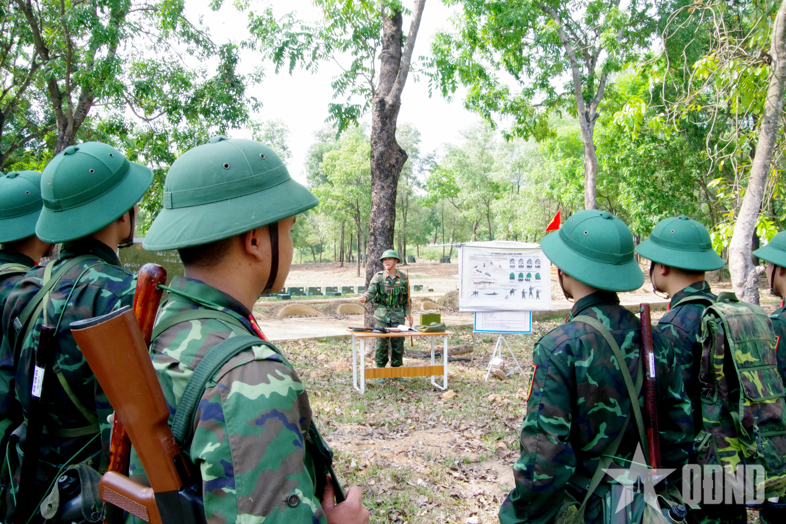 Chiến sĩ mới rèn luyện tư thế đứng bắn, giữ cho súng ổn định, không bị chao lắc.
