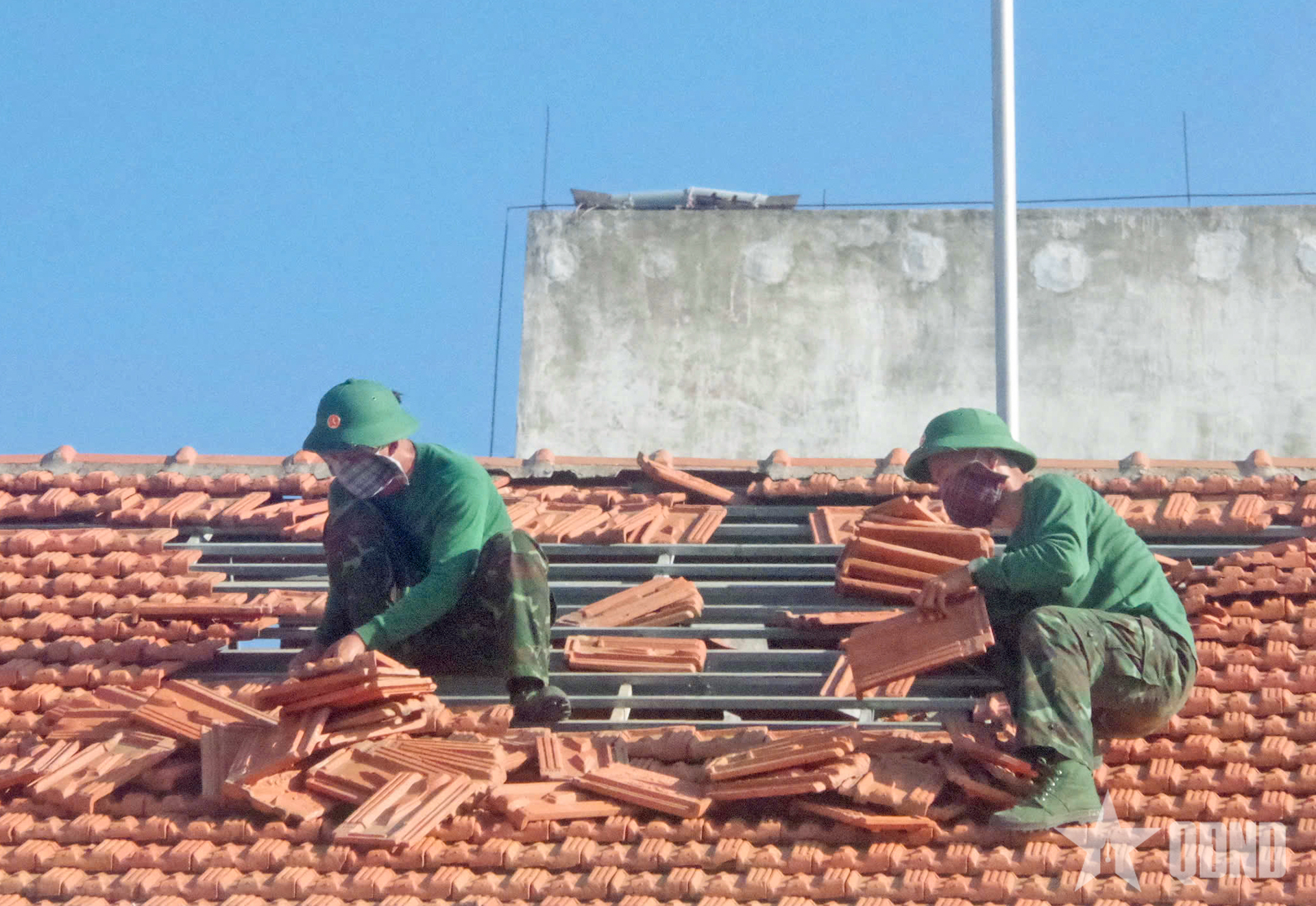 Chiến sĩ Sư đoàn 31 giúp nhân dân lợp lại mái nhà sau bão số 13.