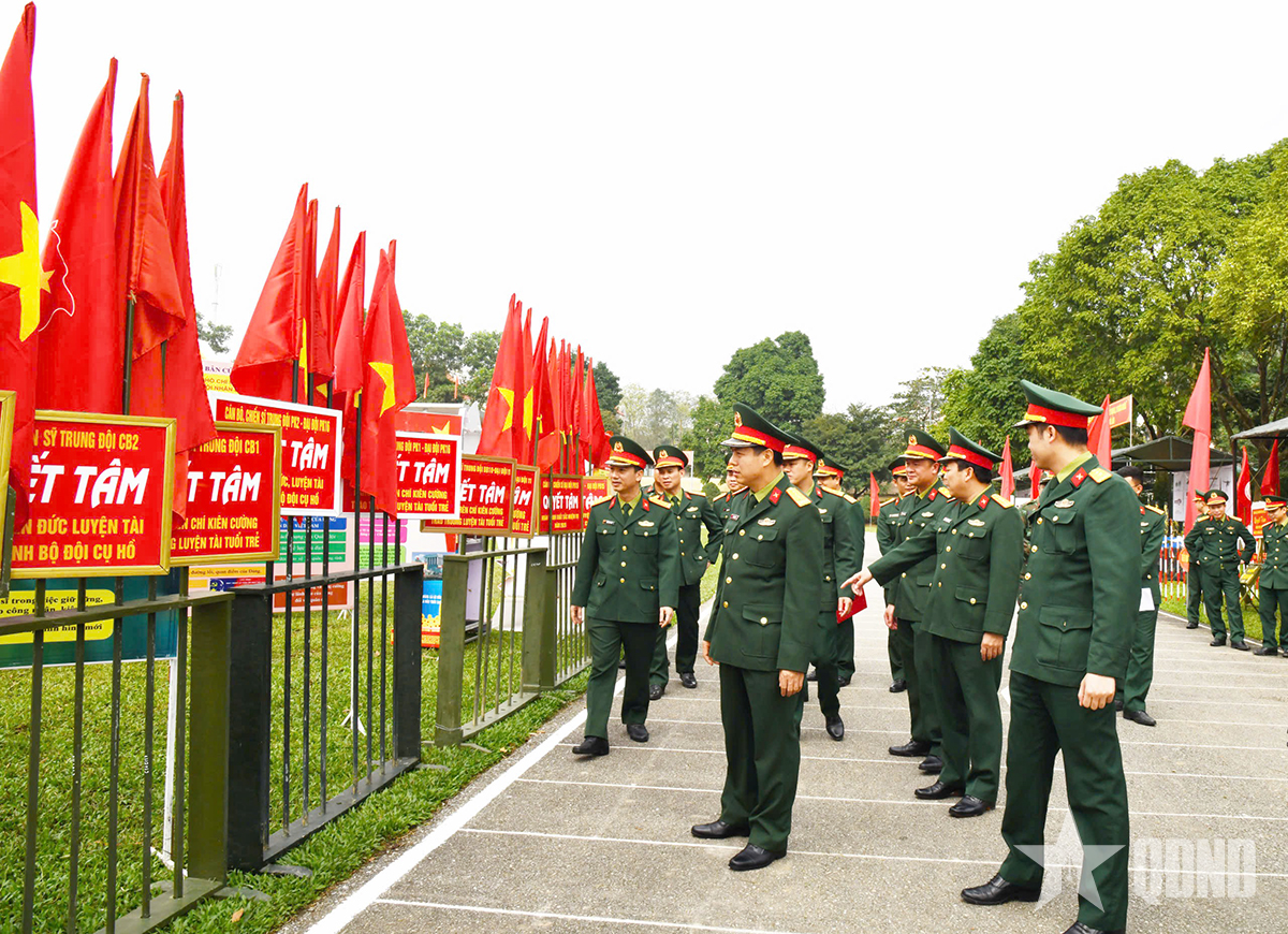 Chỉ huy Sư đoàn 316 kiểm tra khu trung bày hoạt động công tác Đảng, công tác chính trị trong huấn luyện. Ảnh: TUẤN ANH