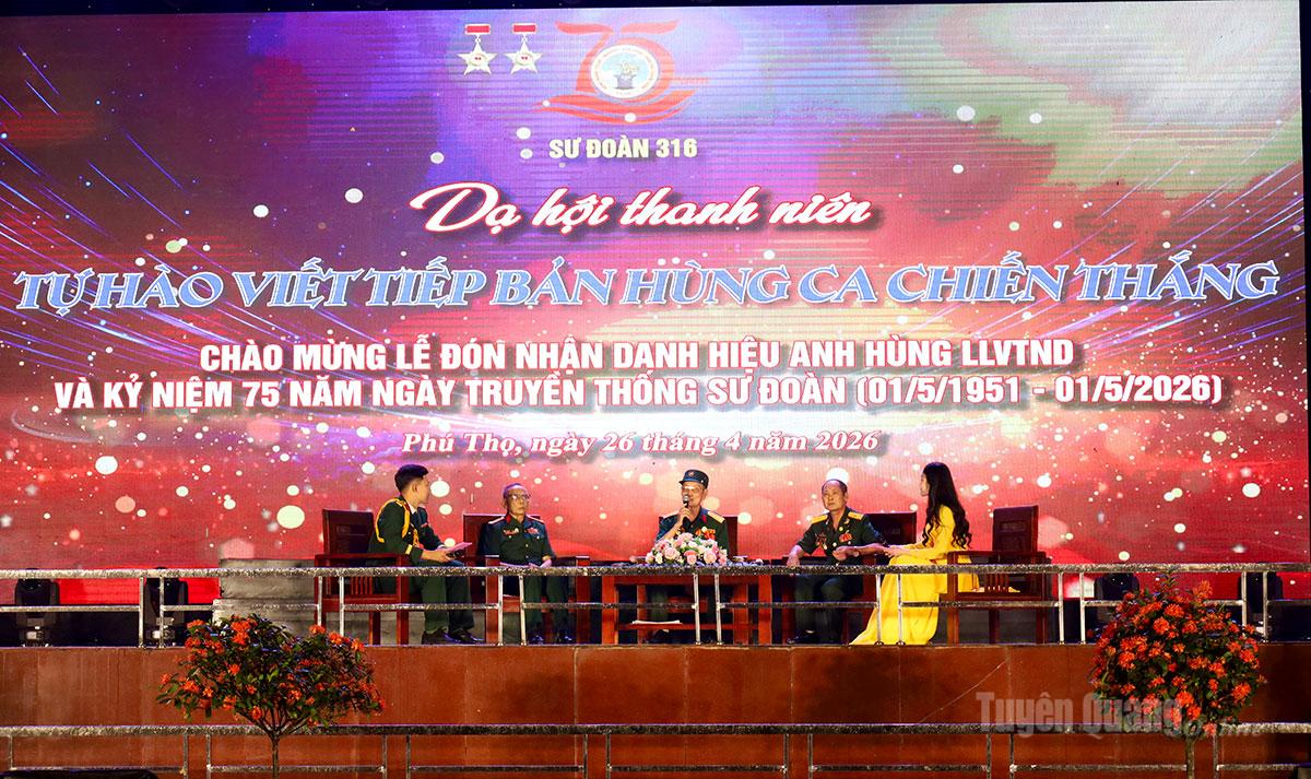 Tại chương trình dạ hội, các đại biểu và cán bộ, chiến sĩ đã xem phóng sự tư liệu; tọa đàm giao lưu với các nhân chứng lịch sử, cán bộ lão thành, đại diện cấp ủy, chính quyền địa phương và chiến sĩ trẻ tiêu biểu của Sư đoàn. Nhiều câu chuyện xúc động về quá trình chiến đấu trong các cuộc kháng chiến, bảo vệ biên giới phía Bắc cùng những chia sẻ về trách nhiệm, khát vọng cống hiến của thế hệ trẻ hôm nay đã góp phần tái hiện chặng đường 75 năm xây dựng, chiến đấu và trưởng thành của Sư đoàn 316.