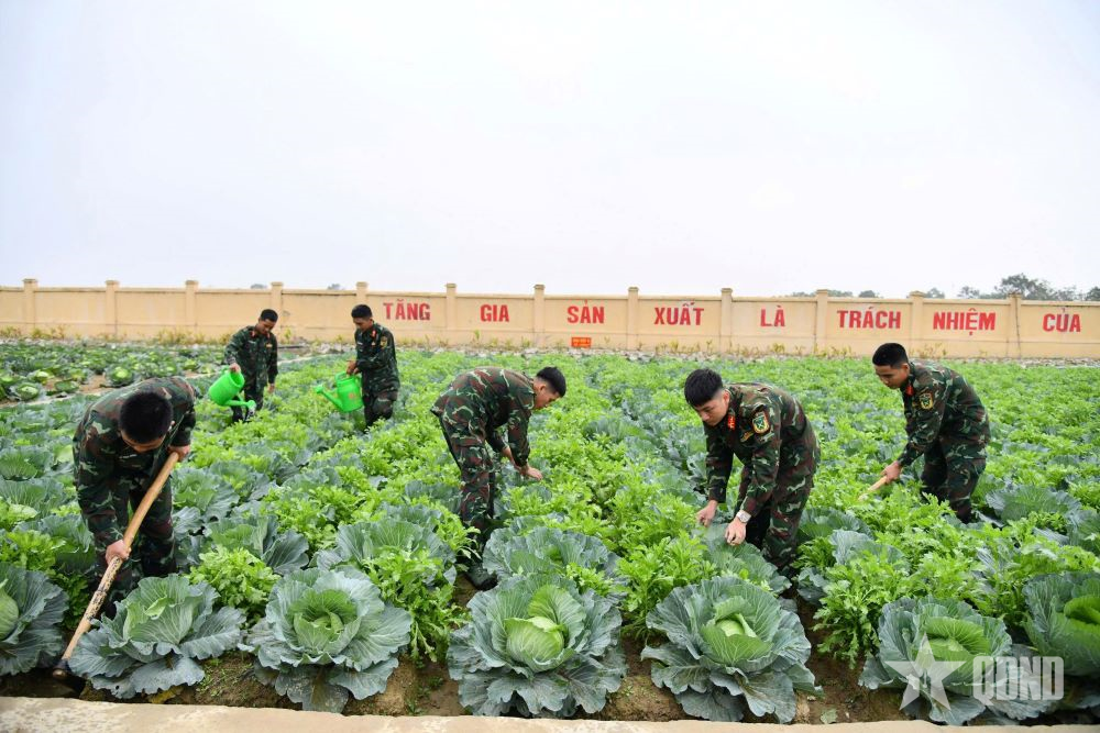 Cán bộ, chiến sĩ Tiểu đoàn 9, Trung đoàn 3, Sư đoàn 324 tích cực tăng gia sản xuất chuẩn bị rau xanh đón chiến sĩ mới.