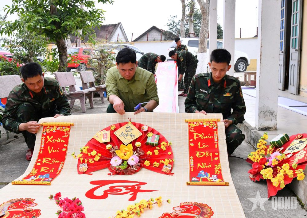 Cán bộ, chiến sĩ trang trí chuẩn bị đón Tết.