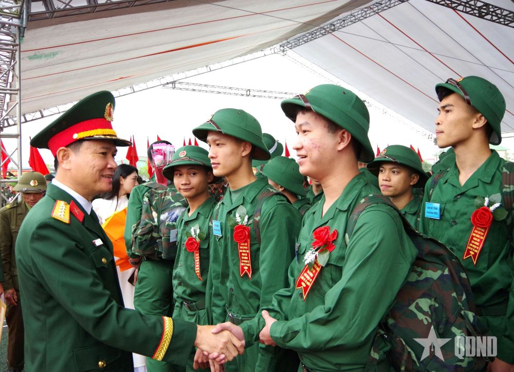 Đại tá Nguyễn Huy Long, Chính ủy Sư đoàn 324 động viên chiến sĩ mới trước khi về đơn vị học tập, công tác.