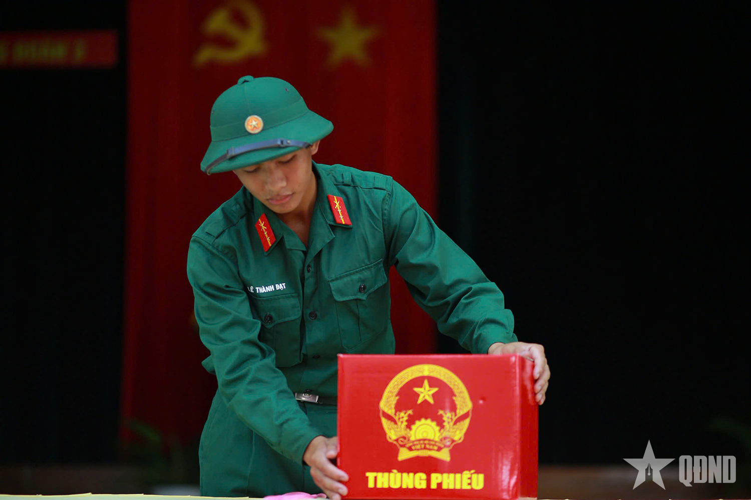 Chiến sĩ tiến hành trang trí thùng phiếu bầu cử.