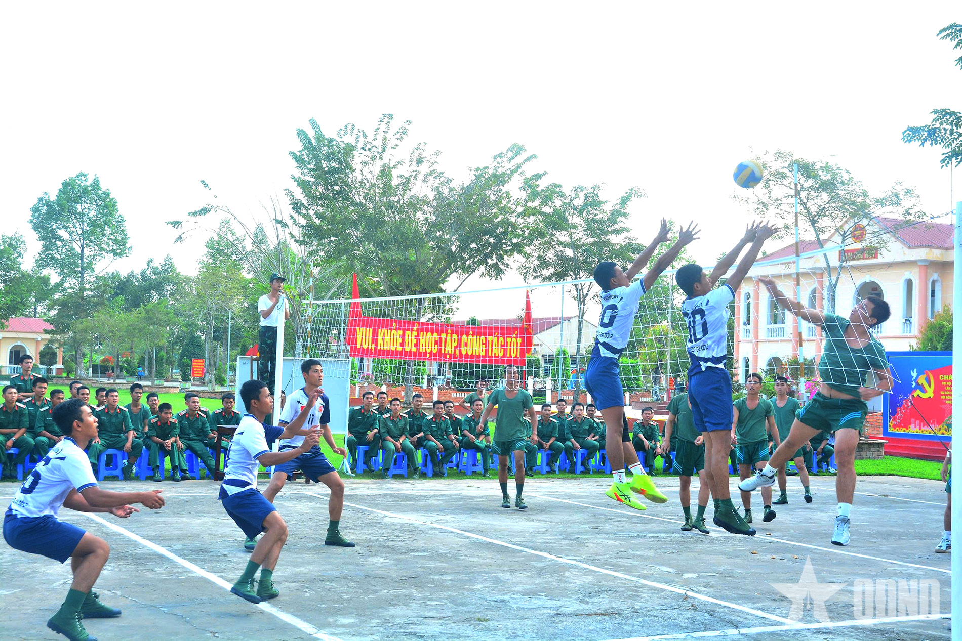 Trận thi đấu bóng chuyền diễn ra hào hứng, thể hiện tinh thần đoàn kết và quyết tâm cao của cán bộ, chiến sĩ Sư đoàn 330.