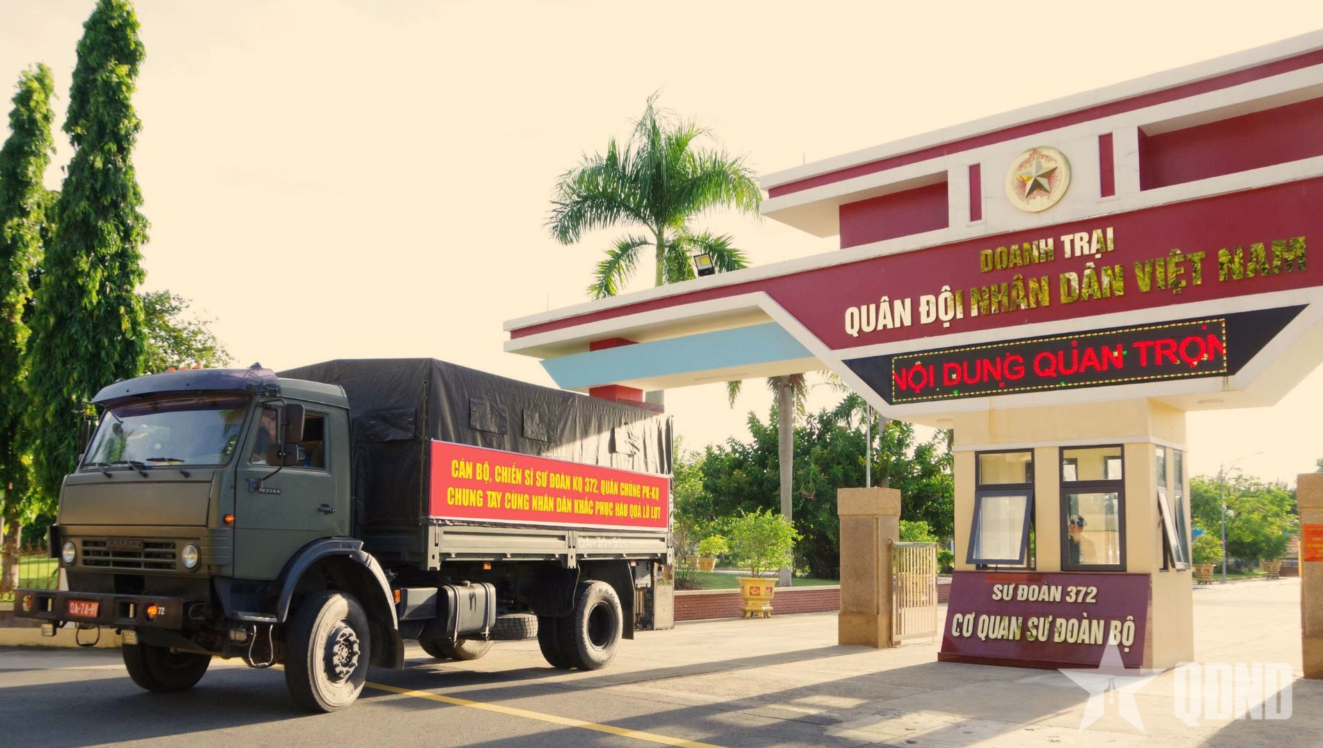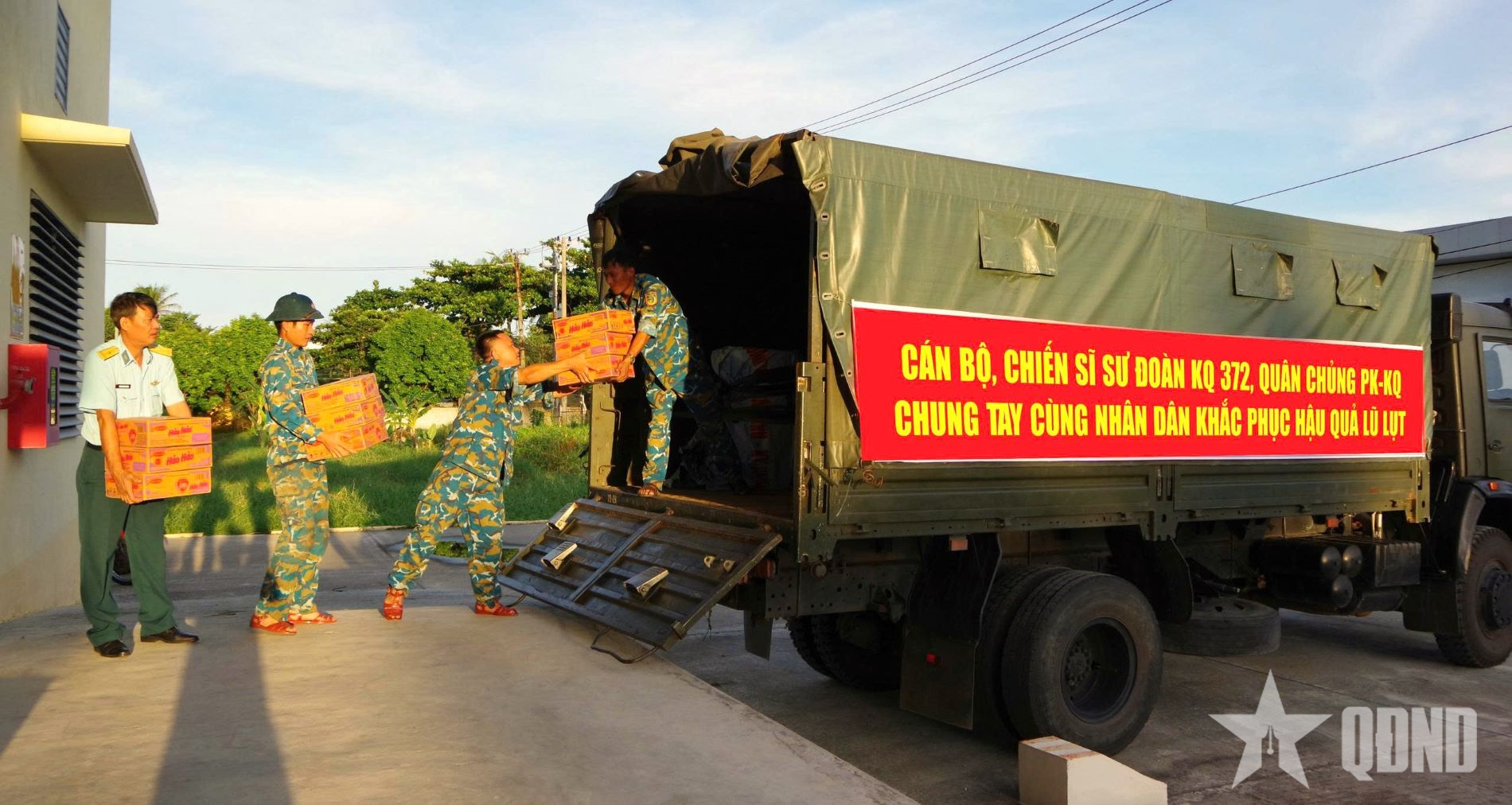 Cán bộ, chiến sĩ Sư đoàn 372 vận chuyển hàng hóa lên xe để gửi đến đồng bào miền Bắc bị ảnh hưởng bởi mưa lũ.