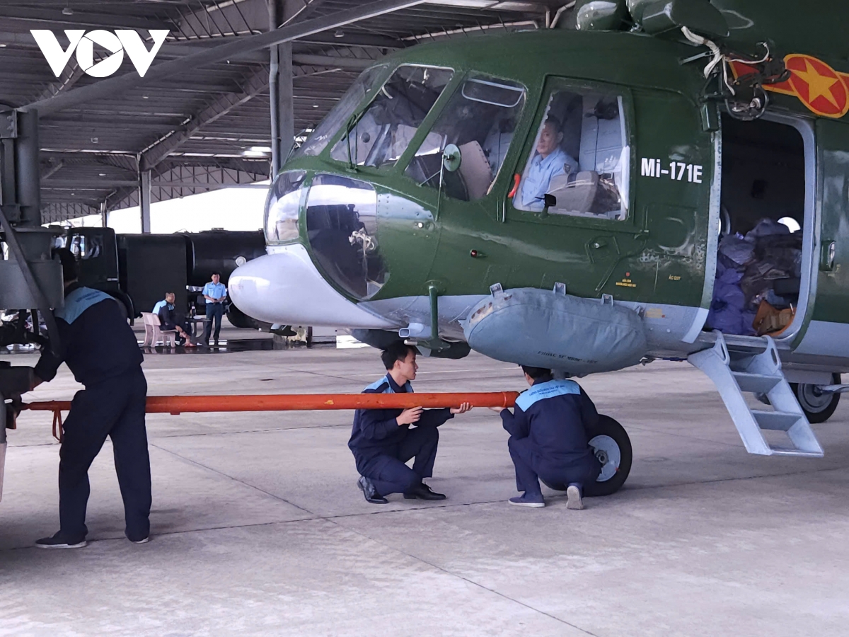 Đúng 6h45, Trung đoàn 930 tại sân bay Phù Cát được lệnh của Quân chủng Phòng không - Không quân làm công tác triển khai bay đối với máy bay trực thăng Mi-17, chuẩn bị tốt mọi mặt từ hậu cần, kỹ thuật, trang bị, lực lượng… để sẵn sàng cất cánh thực hiện nhiệm vụ.