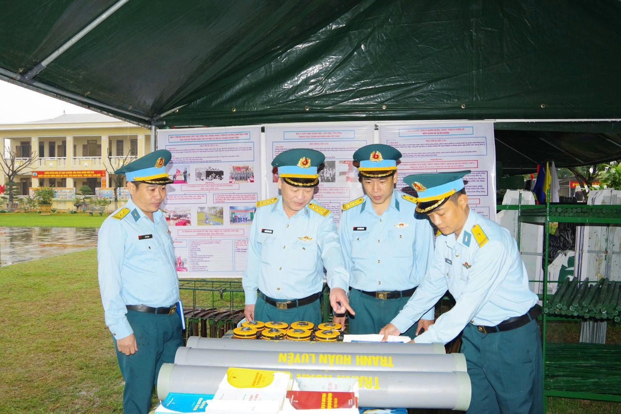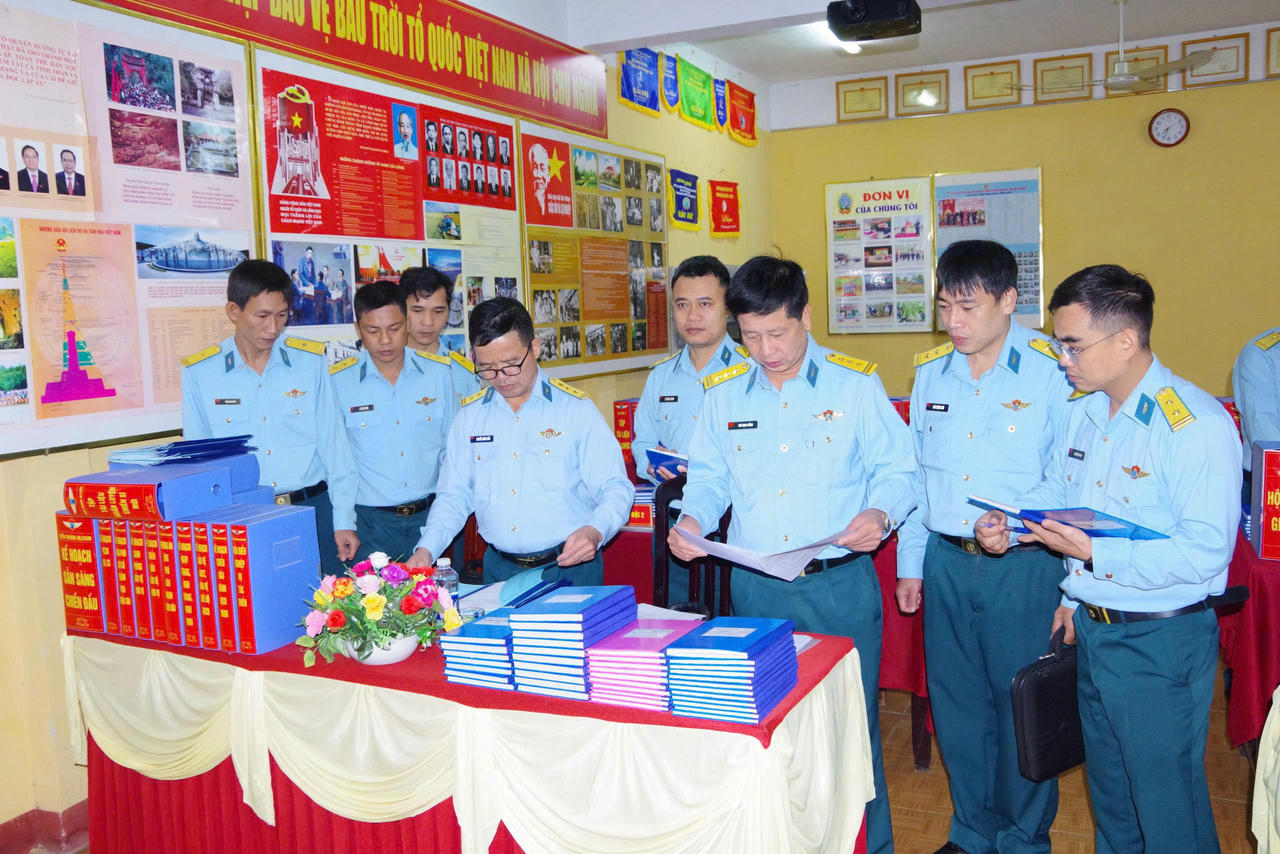 Đoàn kiểm tra của Quân chủng Phòng không - Không quân kiểm tra vật chất, trang bị, sổ sách công tác Đảng, công tác chính trị trong huấn luyện chiến sĩ mới. (Ảnh: Khắc Tâm - Đức Cầu)