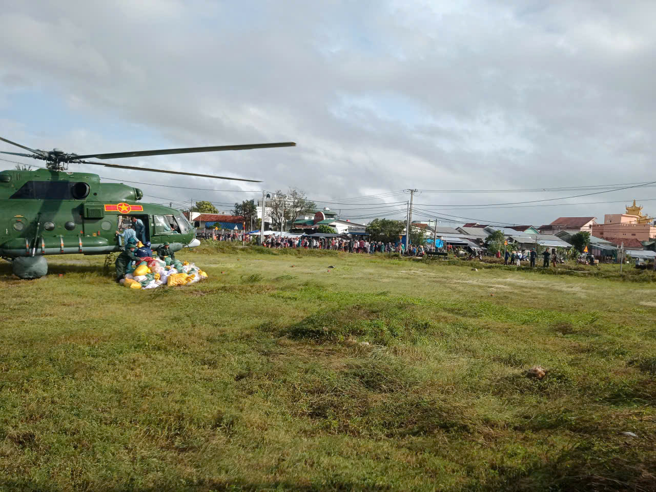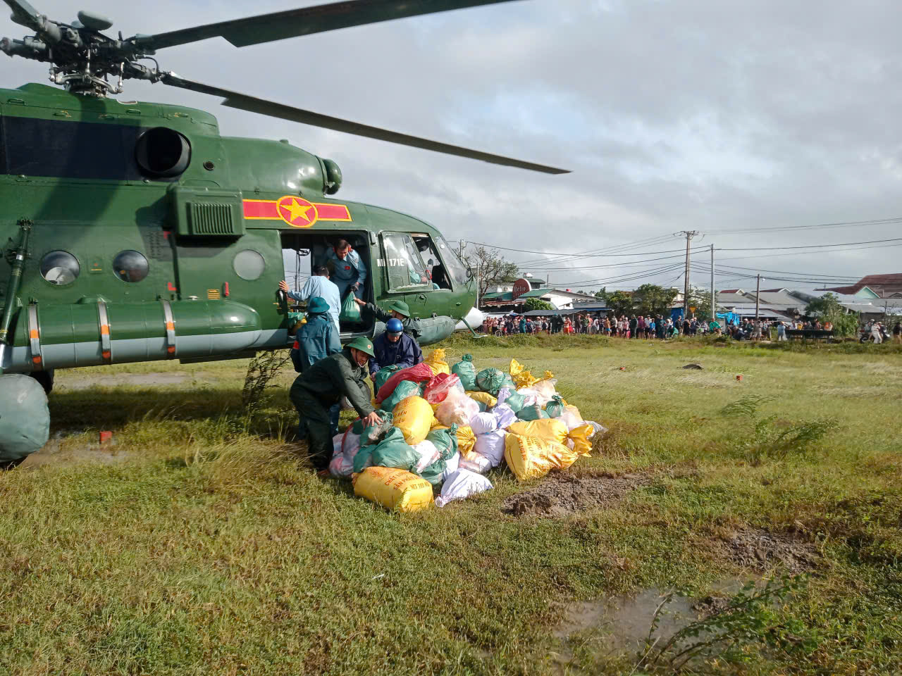 Đúng 7 giờ 32 phút sáng nay, 23-11, trực thăng Mi-17 của Trung đoàn 930 xuất phát từ sân bay Phù Cát, mang theo 1,5 tấn lương thực, thực phẩm và nhu yếu phẩm thiết yếu như lương khô, bánh, sữa, nước uống, áo phao… để tiếp tế cho người dân bị cô lập tại Tuy An Đông, Tuy An Tây và khu vực sân vận động Long Thăng (tỉnh Đắk Lắk).