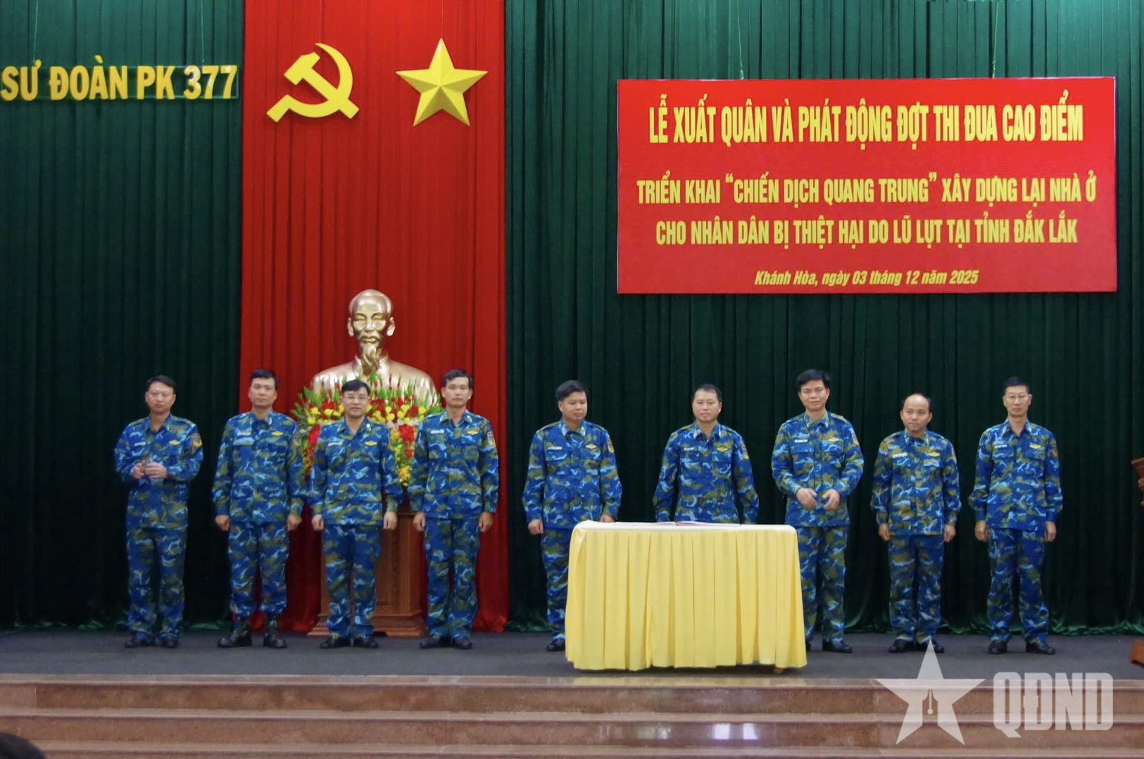 Cán bộ, chiến sĩ Sư đoàn 377 sẽ phối hợp với Bộ tư lệnh Quân khu 5, Bộ CHQS tỉnh Đắk Lắk, thành lập 3 cụm xây dựng, mỗi cụm chia thành 3 tổ, mỗi tổ 15 đồng chí. Các tổ thợ gồm cán bộ, chiến sĩ có tay nghề xây dựng, cơ khí, mộc, điện nước, cùng phương tiện, trang bị và các lực lượng phục vụ, bảo đảm của đơn vị, tiến hành xây mới 9 nhà cho nhân dân xã Tuy An Đông, tỉnh Đắk Lắk.