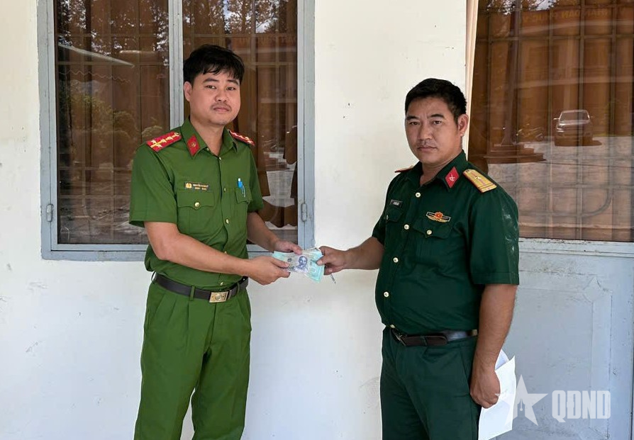 Thiếu tá QNCN Hà Thống Lĩnh bàn giao số tiền tại Công an xã Phú Giáo (TP Hồ Chí Minh).