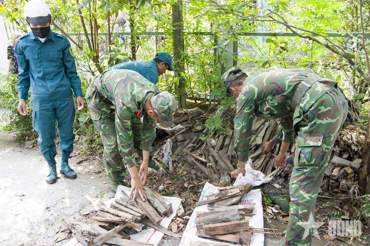 Cán bộ, chiến sĩ Trung đoàn 9, Sư đoàn 8, Quân khu 9 cùng lực lượng dân quân xã giúp nhân dân vệ sinh môi trường.