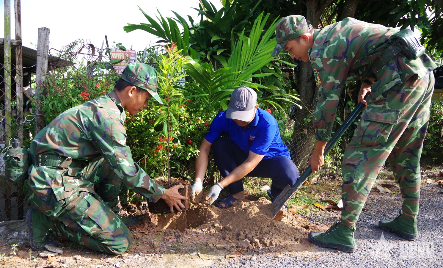Cán bộ, chiến sĩ Trung đoàn 9, Sư đoàn 8, Quân khu 9 cùng đoàn viên thanh niên địa phương trồng hoa các tuyến đường nông thôn.